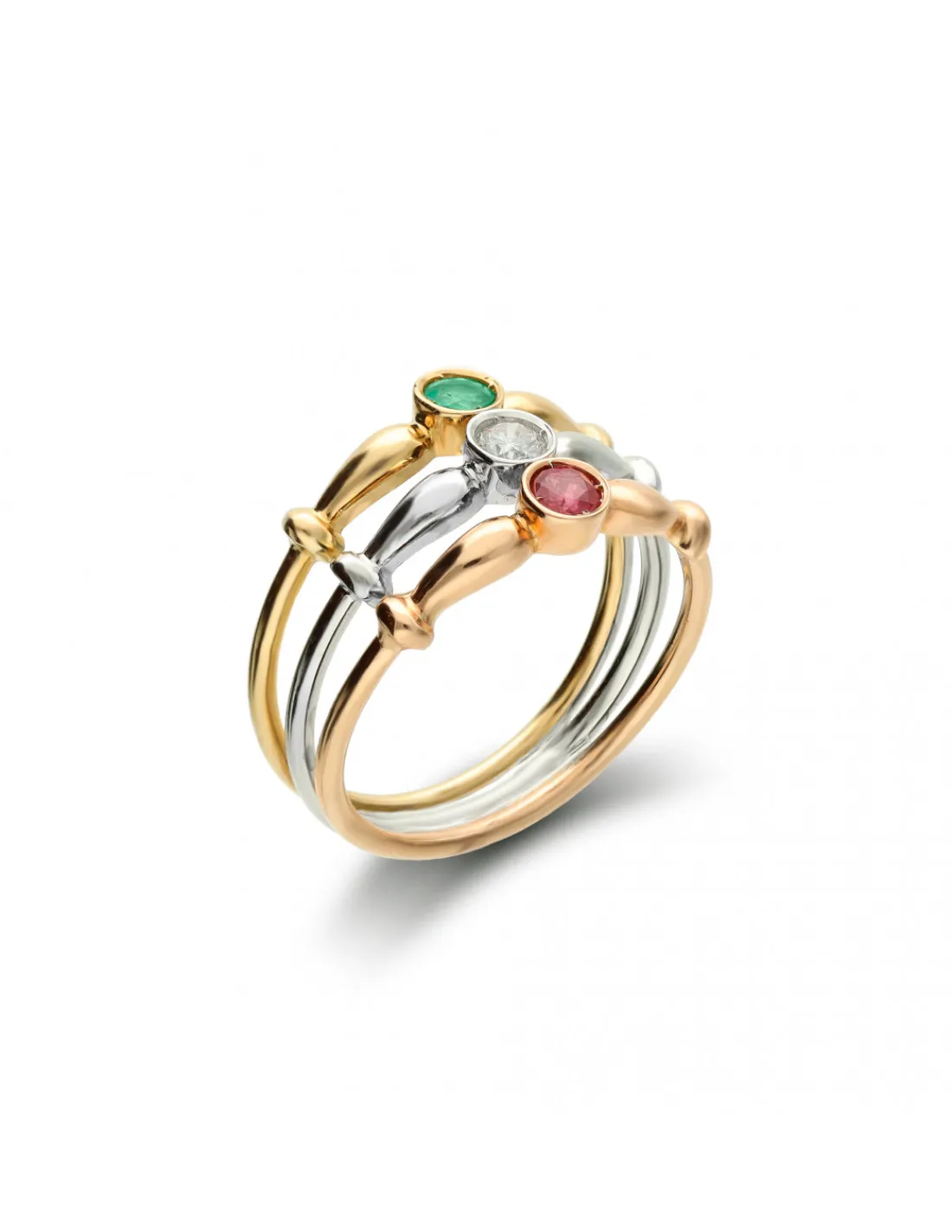 Anillo de oro amarillo y oro blanco 1ª Ley (750 mmas) con triple aro combinado con rubí, diamante y esmeralda.
