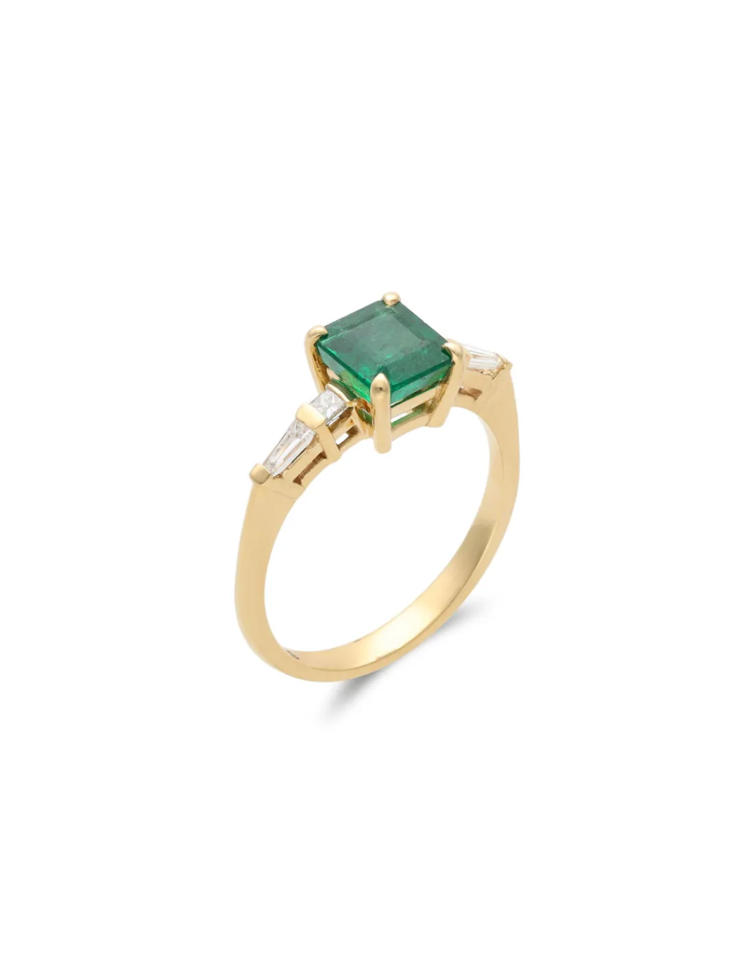 Anillo de oro amarillo 1ª Ley (750 mmas) con esmeralda cuadrada acompañada de diamantes talla brillante y taipe. Talla 14.