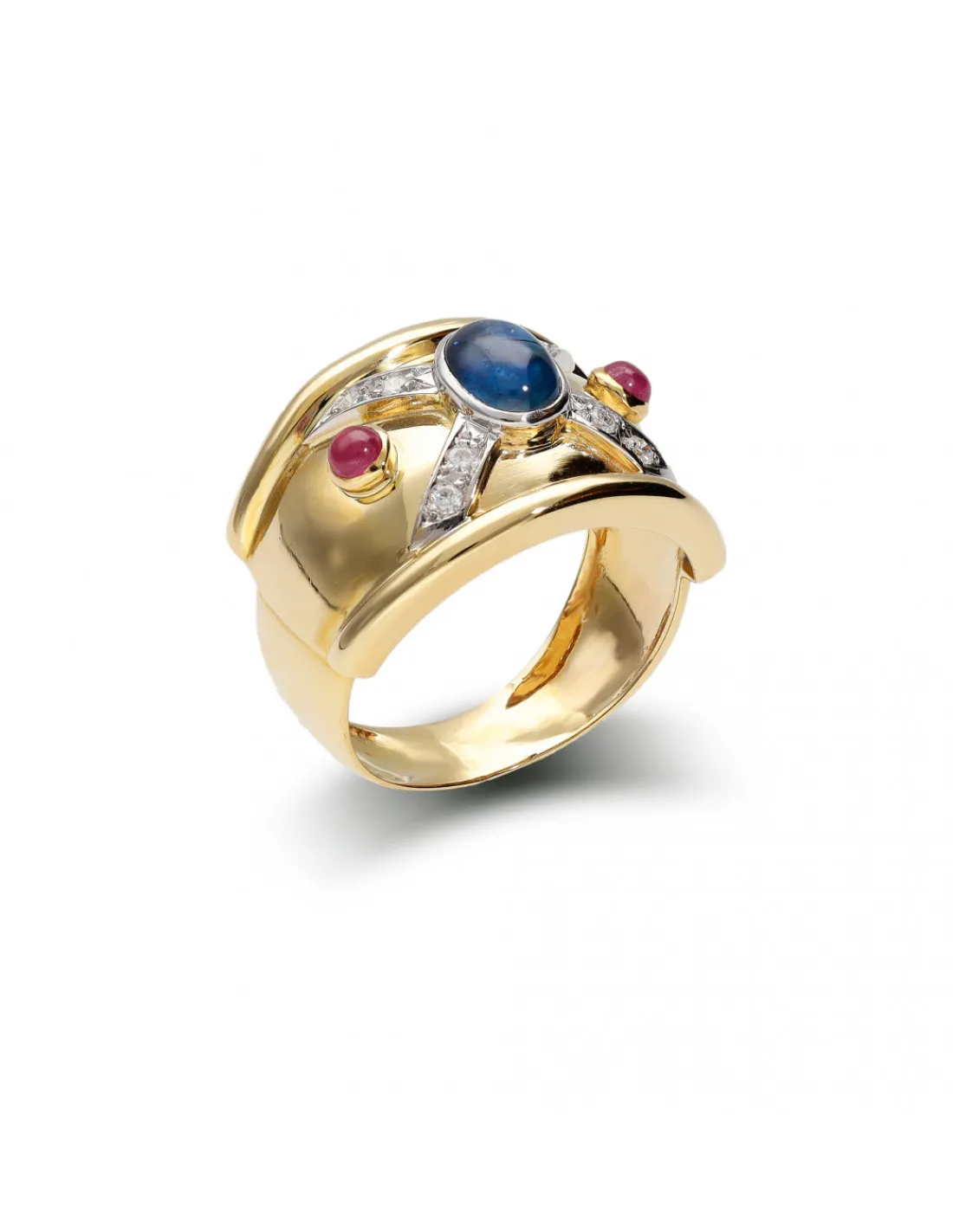 Anillo de oro amarillo 1ª Ley (750 mmas) con zafiro cabujón oval, rubíes y diamantes.