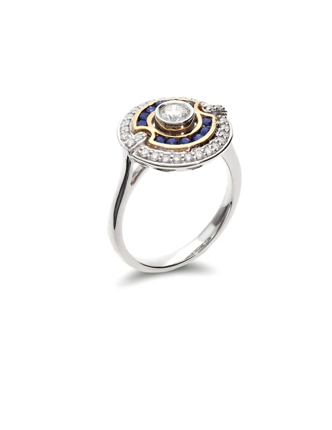 Anillo de oro blanco combinado con oro amarillo 1ª Ley (750 mmas) con un diamante talla brillante en el centro engastado en boquilla rodeado de una orla de zafiros y diamantes.