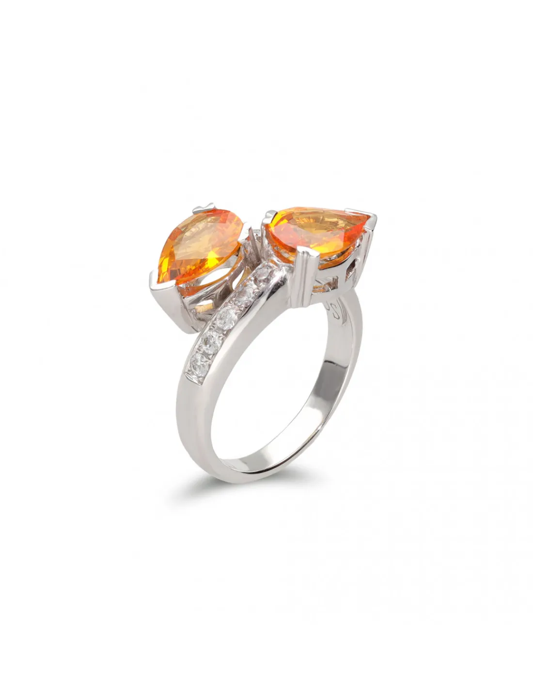 Anillo de oro blanco 1ª Ley (750 mmas) con aro cruzado engastado con diamantes talla brillante y zafiros talla pera color naranja. Una joya única que brilla por su elegancia. Talla 13.