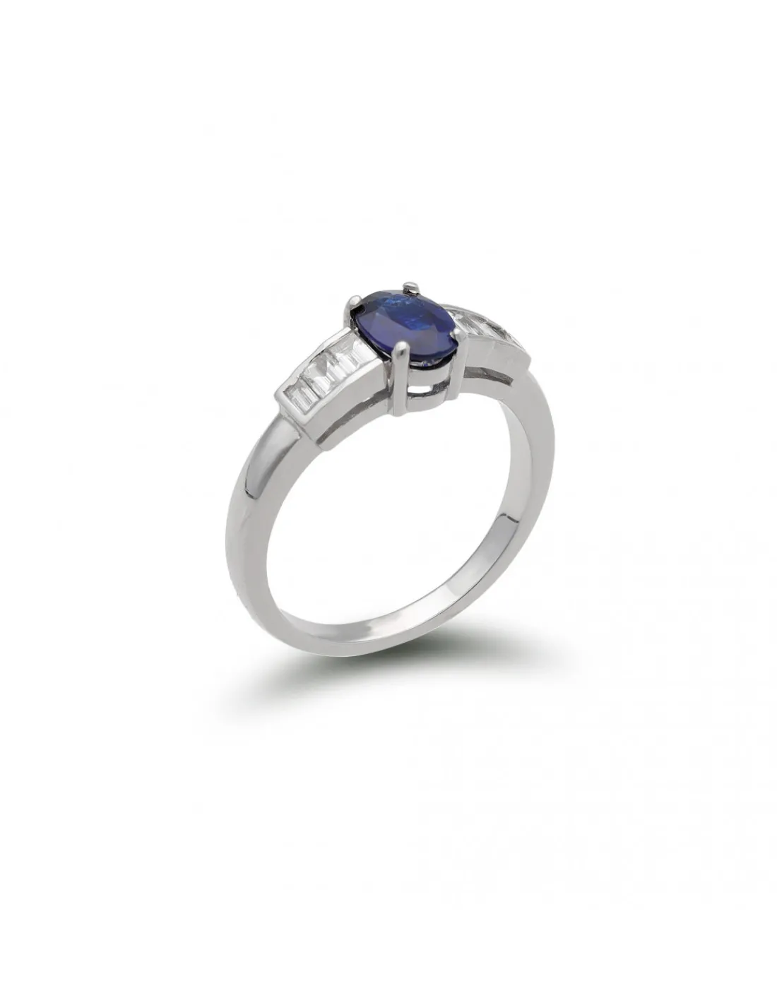 Anillo de oro blanco 1ª Ley (750 mmas) con un zafiro talla oval en el centro y diamantes talla baguette en los laterales.