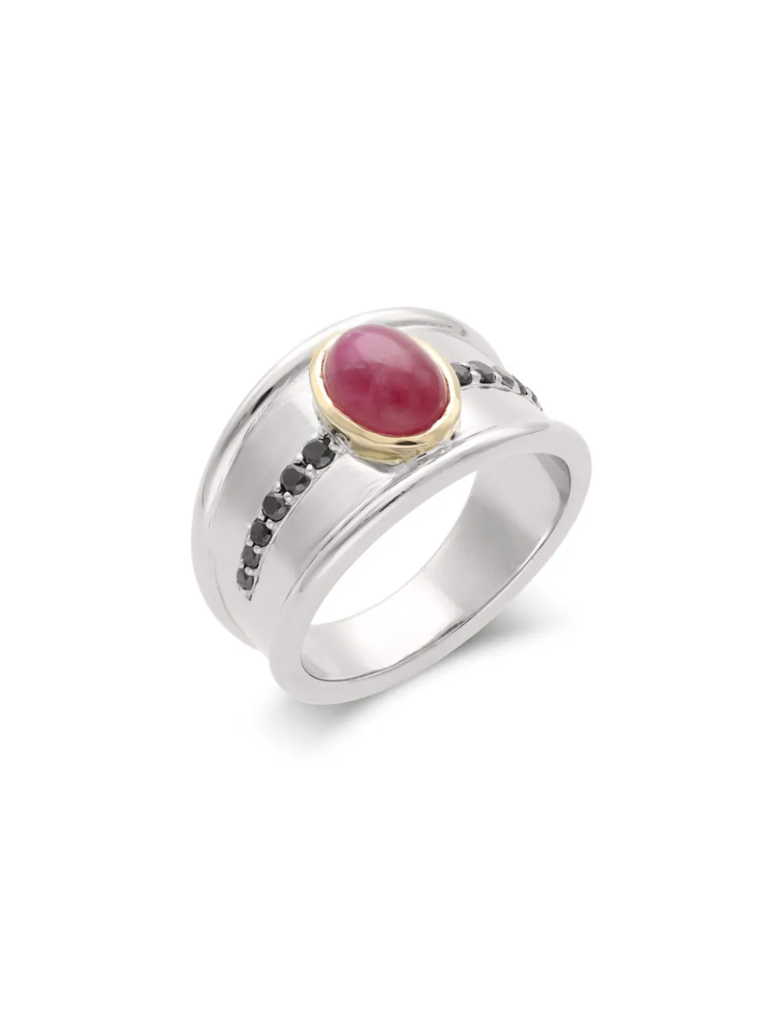Anillo de oro blanco 9 kt (375 mmas) con rubí cabujón talla oval engastado en boquilla de oro amarillo 9 kt acompañado de diamantes negros a cada lado. Talla 14.