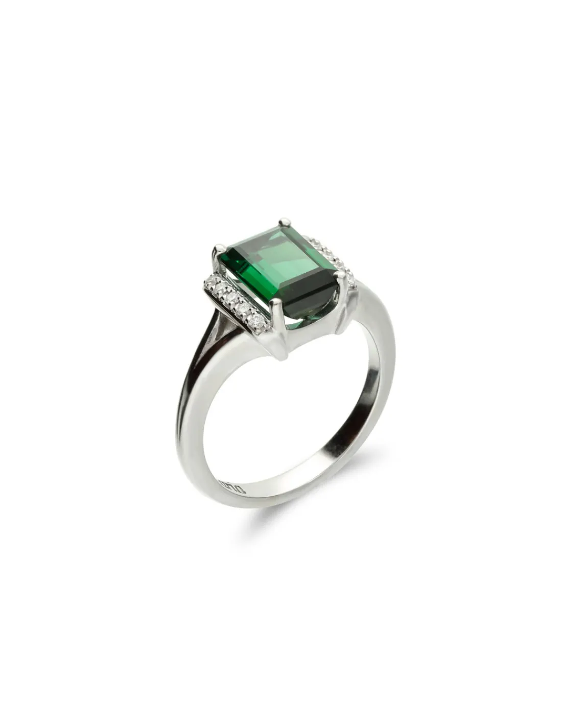 Anillo de oro blanco 1ª Ley (750 mmas) con turmalina talla esmeralda en el centro y diamantes talla brillante a cada lado. Una joya llamativa que aporta claridad y destaca por su elegante y brillante piedra verde.
