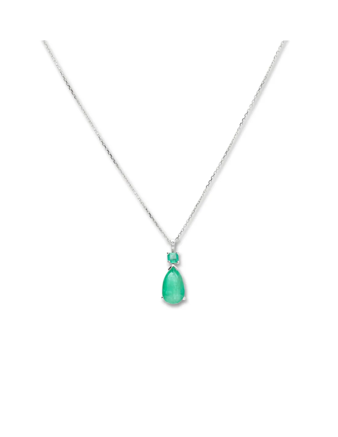 Cadena-Colgante de oro blanco 9 kt (375 mmas) con esmeralda cuadrada y esmeralda talla pera combinadas con dos diamantes talla brillante. Longitud cadena 42,5 cm. Tamaño del colgante incluyendo reasa 2 cm.