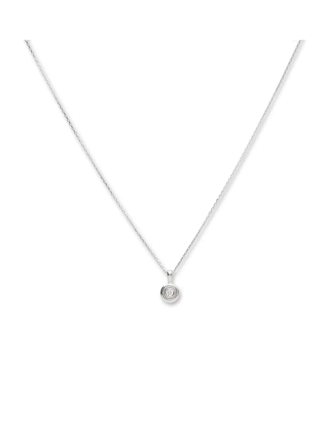 Cadena-Colgante de oro blanco 9 kt (375 mmas) con diamante talla brillante engastado en boquilla. Longitud cadena 42,5 cm. Tamaño del colgante incluyendo reasa 1,1 cm.