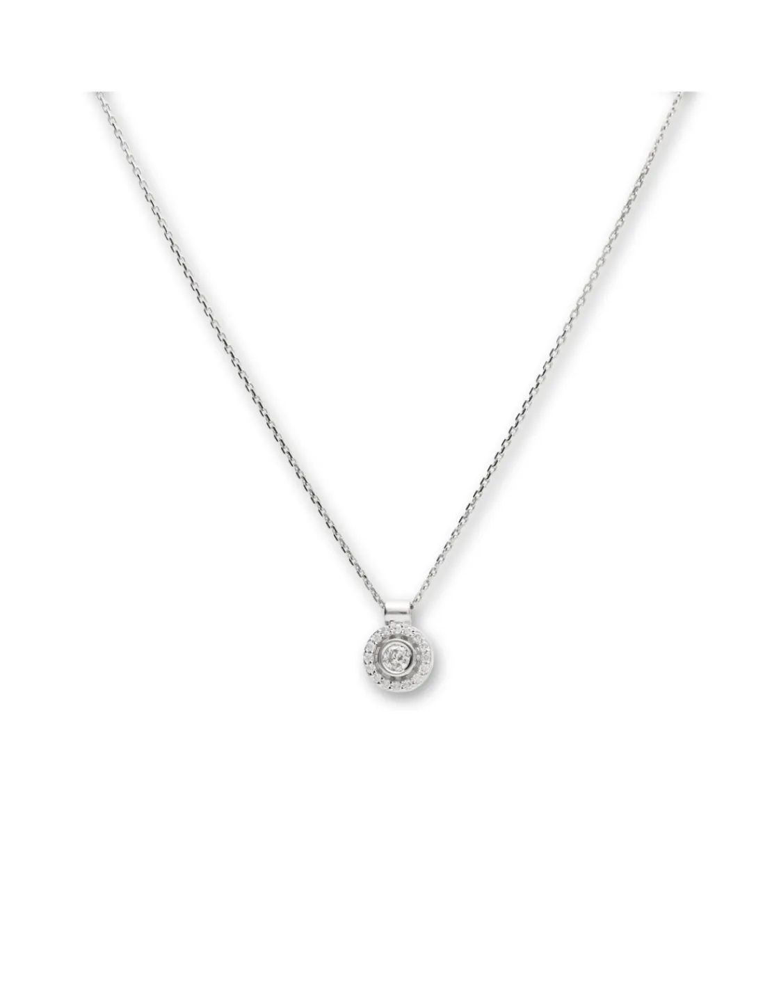 Cadena-Colgante de oro blanco 9 kt (375 mmas) con un diamante central rodeado de una orla de diamantes.