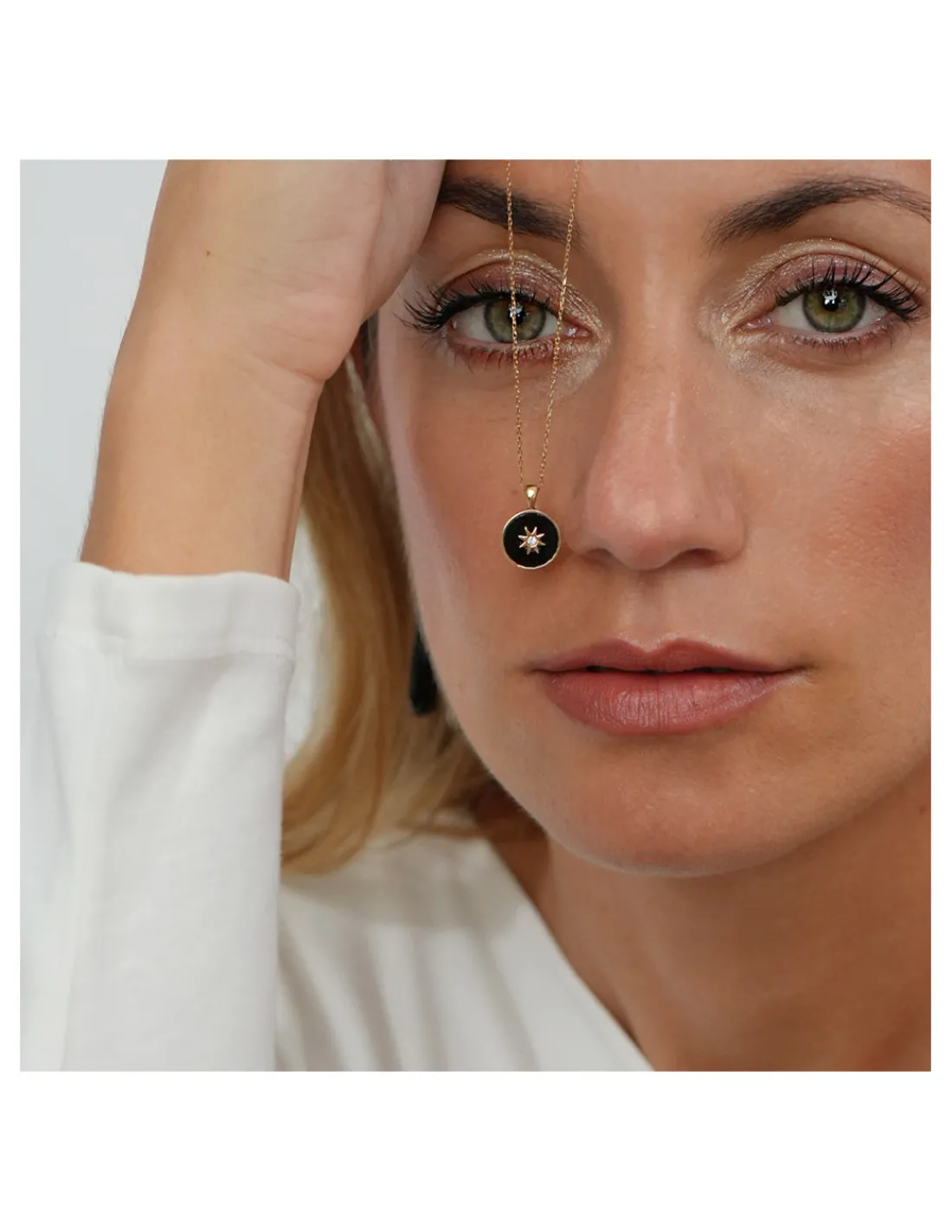 Colgante de oro amarillo 1ª Ley (750 mmas) con diamante en el centro combinado con disco de ónix. Un colgante de la colección Eclipsia que evoca el misterio y el encanto de la noche.