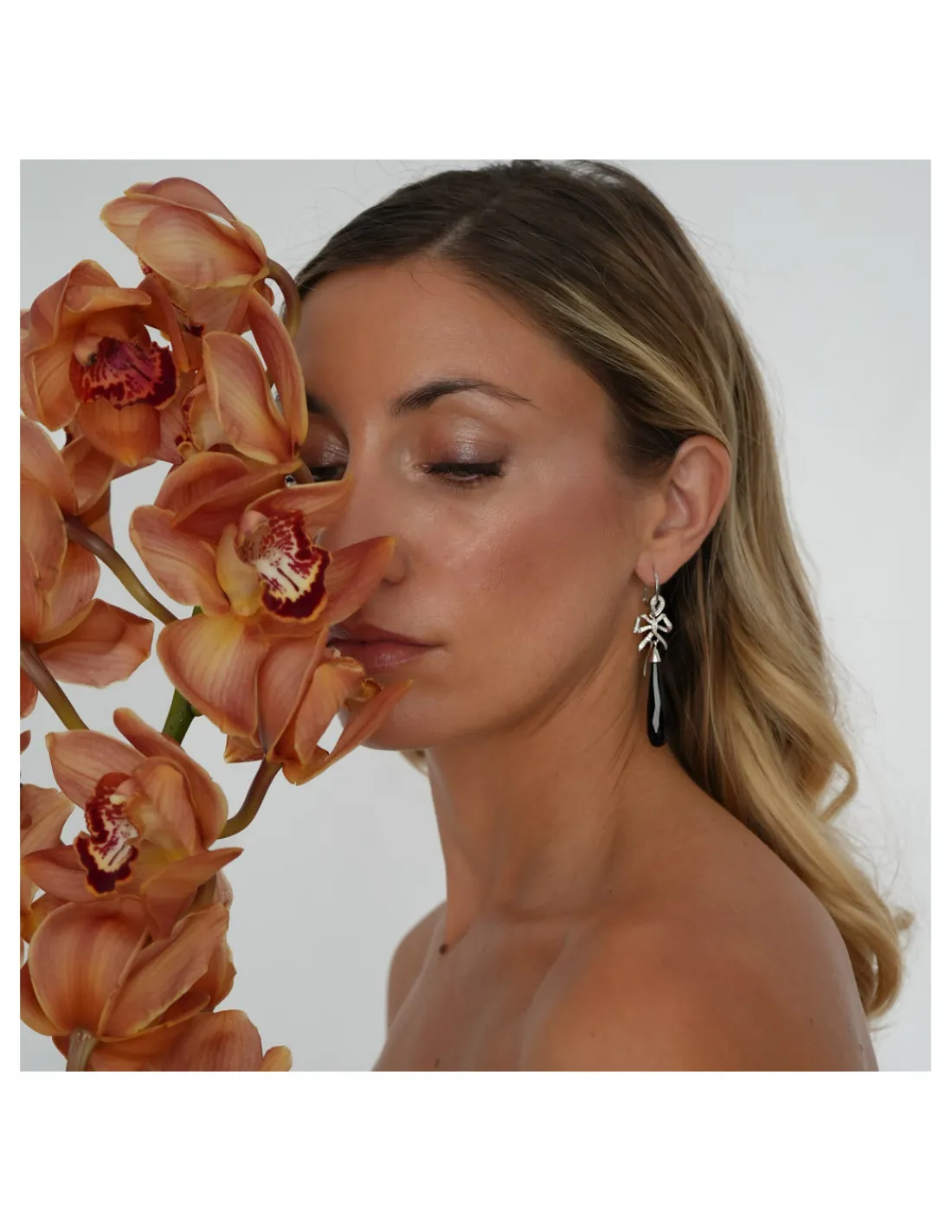 Pendientes de oro blanco 1ª Ley (750 mmas) con una lágrima de ónix en su base y un delicado diseño en forma de lazo de oro blanco con diamantes. Un pendiente muy versátil gracias a su opción desmontable.
