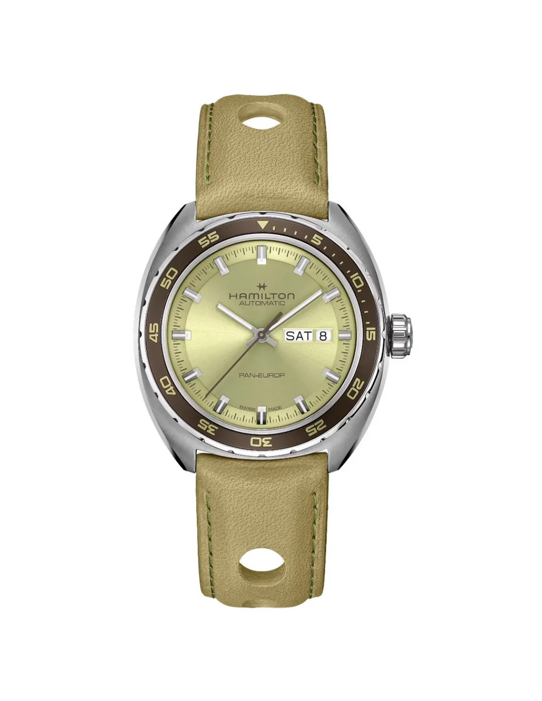 Reloj Hamilton American Classic Pan Europ Day Date Auto para hombre con caja de acero de 42 mm con forma de cojín y bisel giratorio unidireccional, esfera color verde, cristal de zafiro y correa de piel de vaca perforada verde de tacto suave. Presenta un diseño de inspiración vintage de la década de 1960. El Pan Europ Automatic, deportivo por excelencia, muestra una fuerza de carácter equilibrada con una gama de colores sutiles pero contrastados. Movimiento automático Swiss Made (calibre H-30) y 80 horas de reserva de marcha.