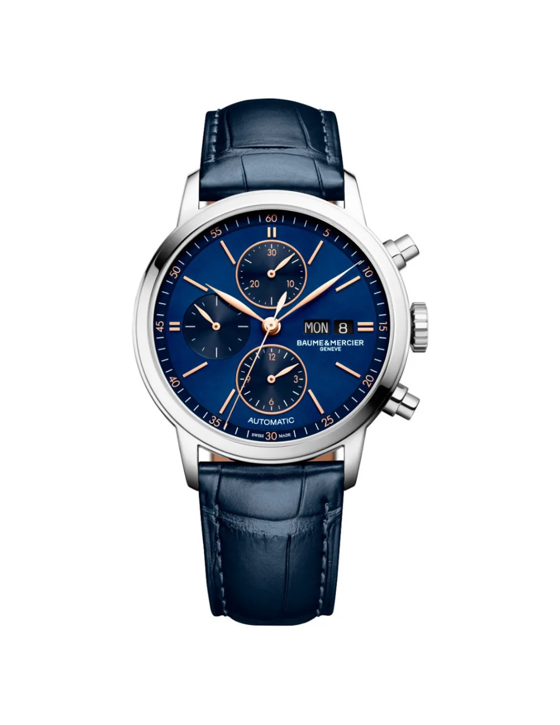 Reloj Baume et Mercier Classima con caja de acero de 42 mm de diámetro, esfera azul con acabado satinado soleil, detalles dorados y subesferas snailed. Un reloj que incorpora ventanillas de día y fecha combinado con correa de piel de aligátor azul con triple hebilla desplegable y ajustable. Movimiento automático Swiss Made con 48 horas de reserva de marcha.