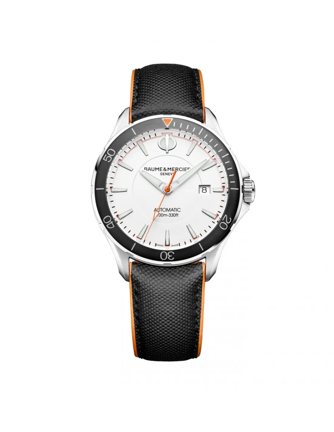 Reloj Baume et Mercier Clifton Club 10337 para hombre con caja de acero, esfera blanca alojada en una caja deportiva y correa de lona negra con detalles naranjas a juego con las agujas del segundero. Movimiento automático Swiss Made.