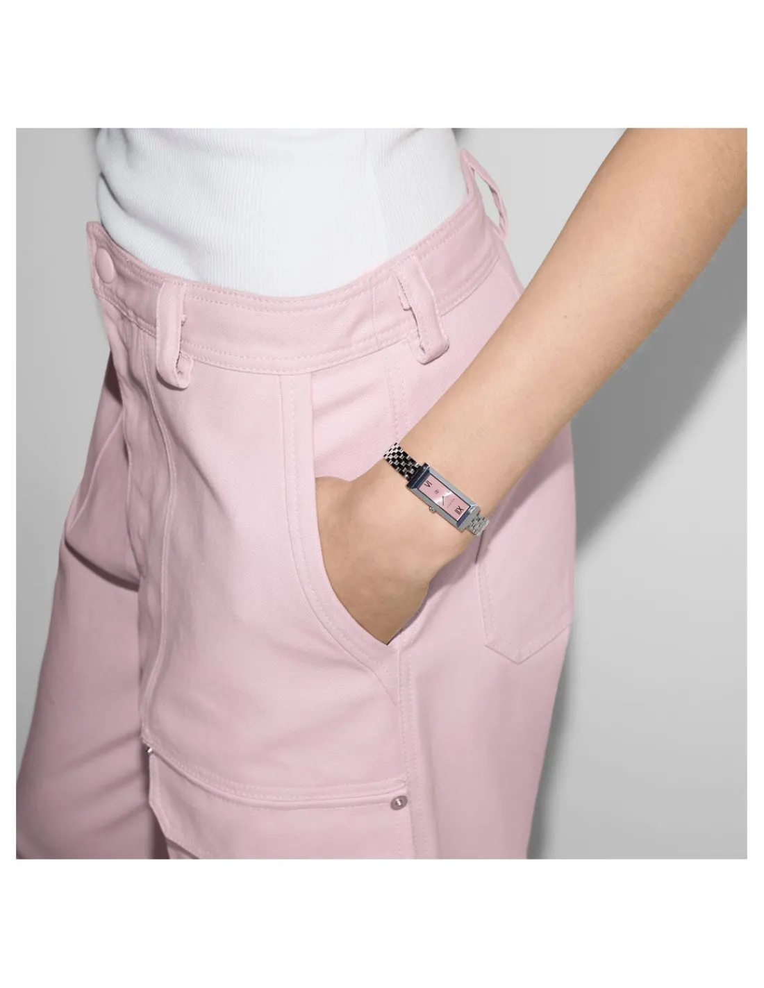 Reloj Gucci G-Frame con caja rectangular de acero inoxidable de 14 x 34 mm, esfera rosa con diamantes engastados y con numeración romana a las 12 y a las 6 en punto, cristal de zafiro con revestimiento antirreflectante y brazalete de acero. Tamaño ajustable a la muñeca de 140 mm a 175 mm. Movimiento de cuarzo Swiss Made.