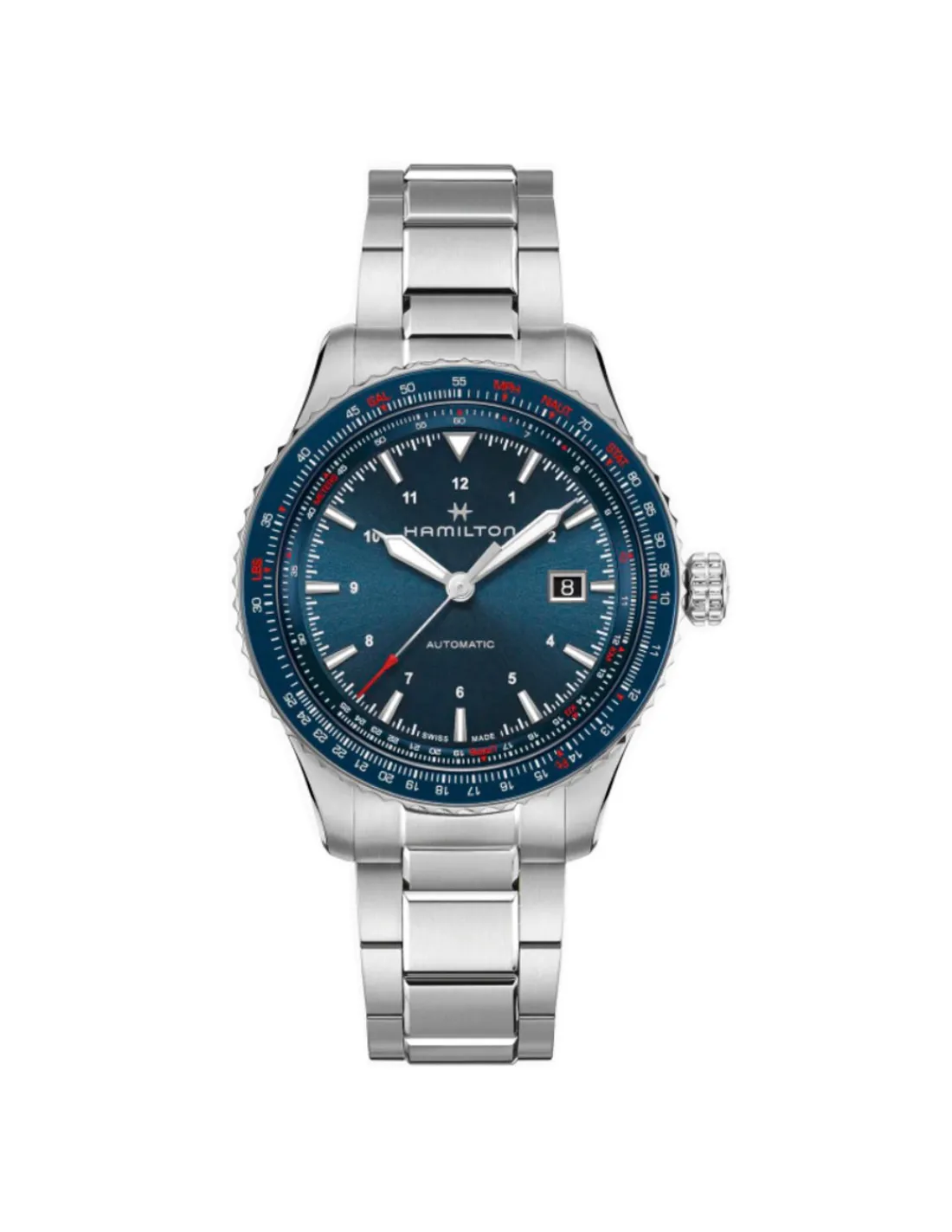 Reloj Hamilton Khaki Aviation Converter con brazalete y caja de acero de 42 mm, esfera azul de gran legibilidad. Permite a los pilotos y los aventureros urbanos hacer cálculos en pleno vuelo gracias a su bisel con regla de cálculo azul a juego. Movimiento automático H-10 Swiss Made con 80 horas de reserva de marcha.