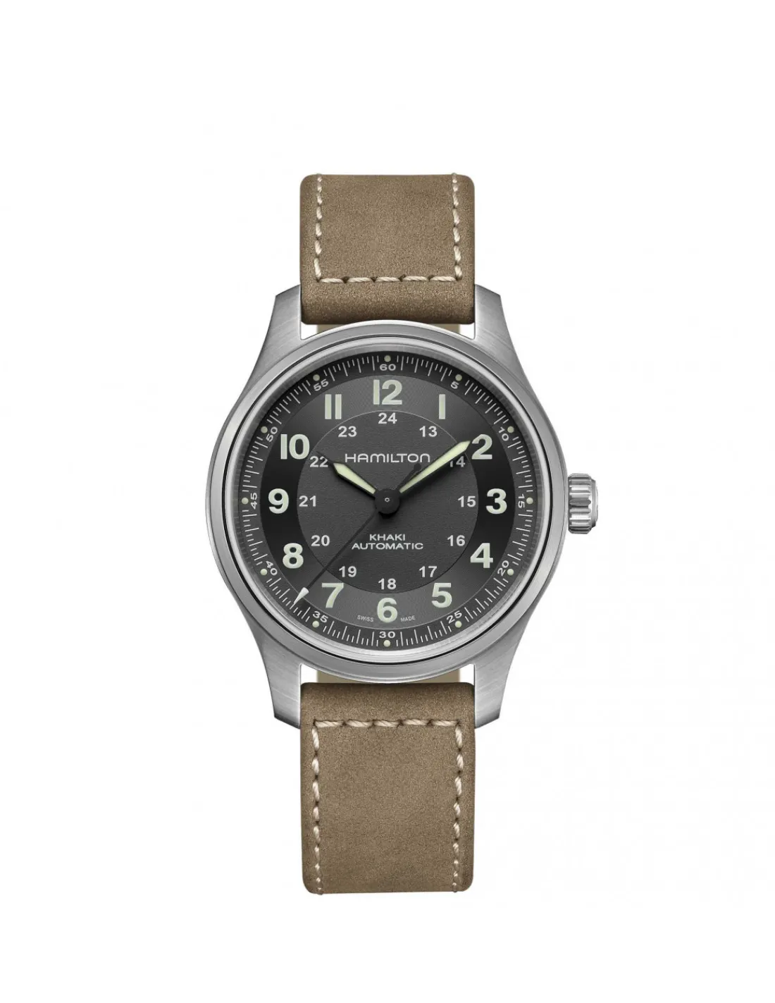 Reloj Hamilton Khaki Field Titanium para hombre con caja de titanio de 42 mm, esfera negra y correa de piel de becerro color marrón. Un reloj ligero, funcional y con estilo militar. Movimiento automático Swiss Made.