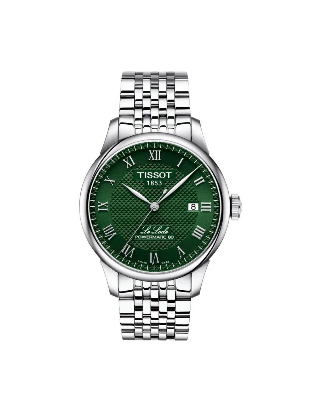 Reloj Tissot Le Locle Powermatic 80 con caja de acero inoxidable de 39,3 mm de diámetro, cristal de zafiro abombado resistente a los arañazos, esfera verde guilloché con números romanos combinado con brazalete de acero. Movimiento automático Swiss Made con hasta 80 horas de reserva de marcha.