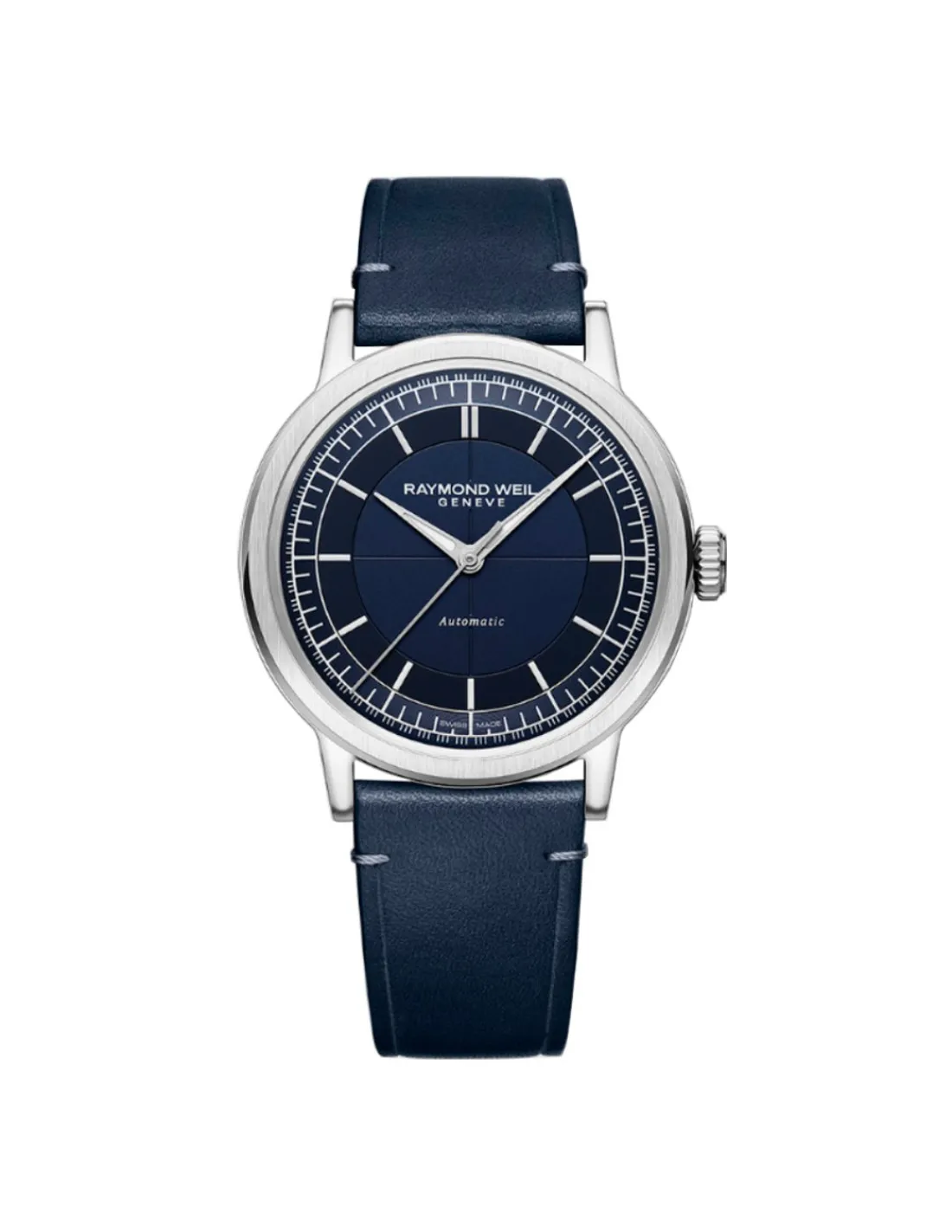 Reloj Raymond Weil Millesime 2925-STC-50001 para hombre con caja de acero, esfera azul y correa de piel azul. Movimiento automático Swiss Made con 38 horas de reserva de marcha.