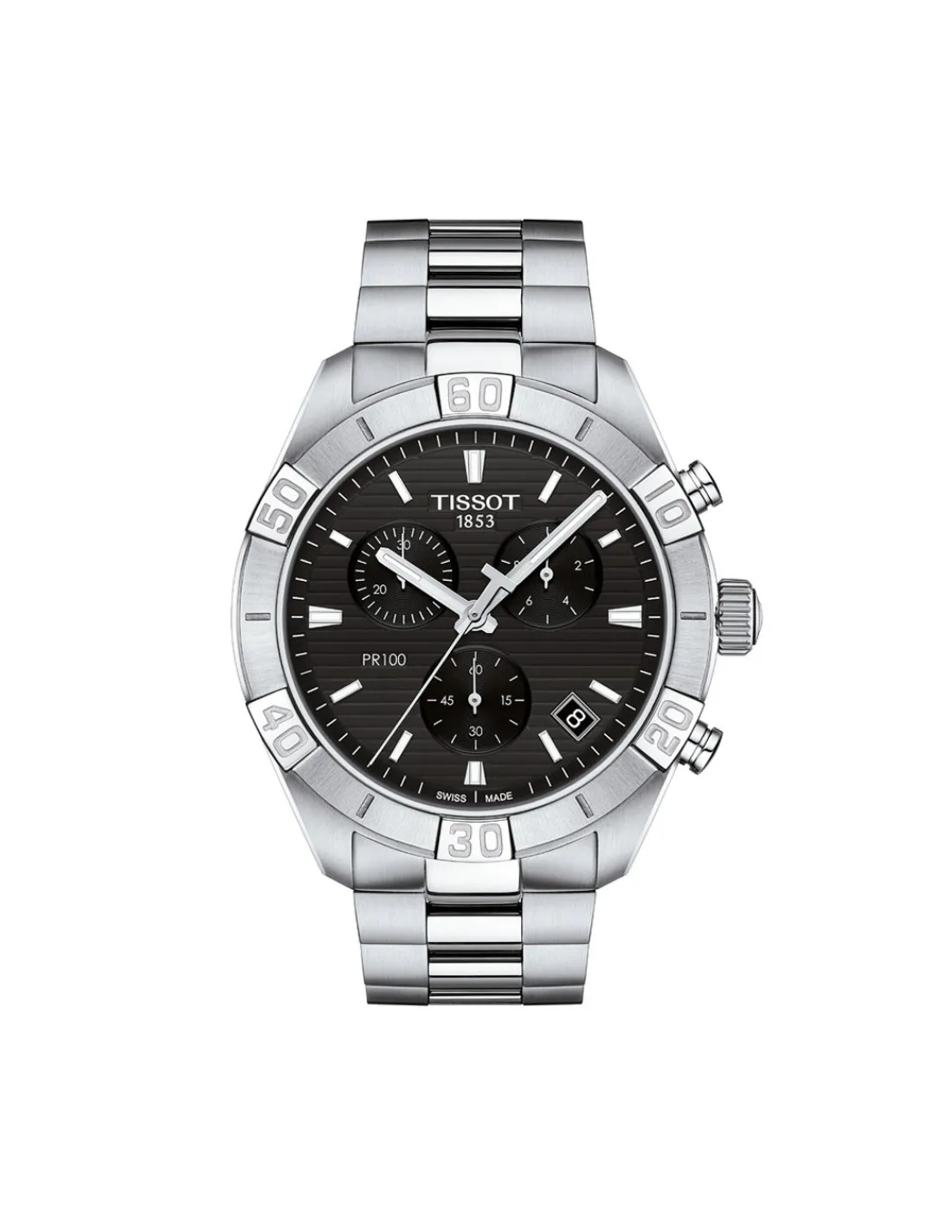 Reloj Tissot PR100 Sport Chronograph para hombre con caja de acero de 44 mm de diámetro, esfera negra con líneas horizontales y brazalete de acero. Esta versión masculina combina un diseño atemporal con la elegancia de los detalles de espíritu deportivo, como el bisel o la esfera. Movimiento de cuarzo Swiss Made.