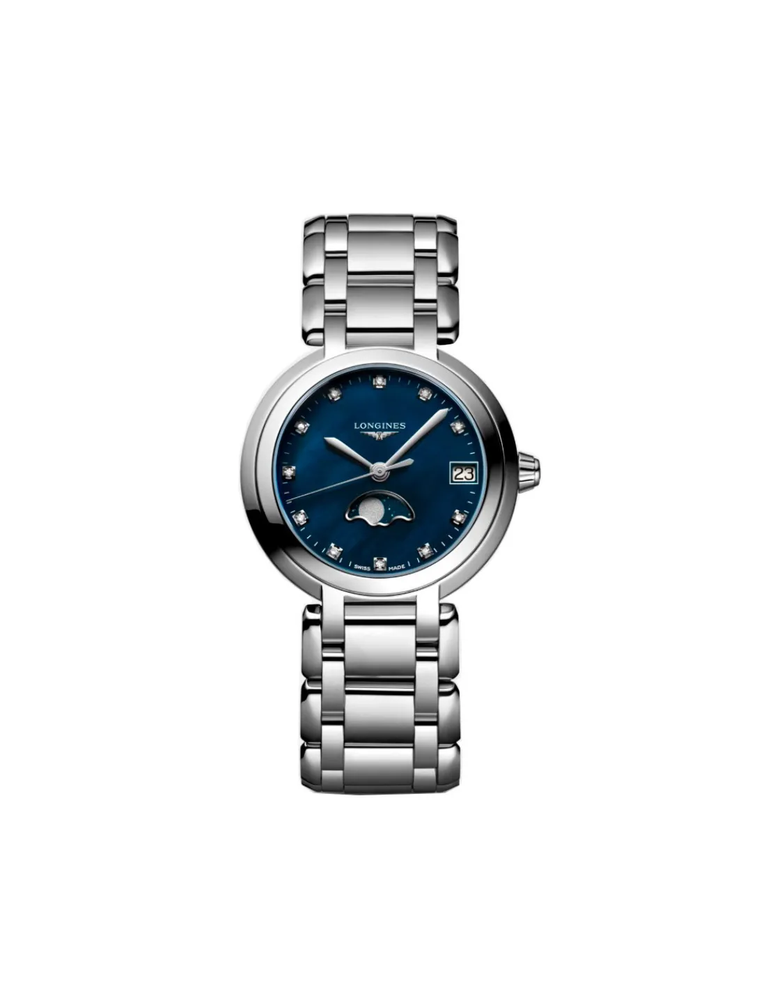 Reloj Longines PrimaLuna para mujer con brazalete y caja de acero de 30,5 mm, esfera azul clara nacarada engastada con once diamantes y agujas plateadas pulidas. Un reloj inspirado en el brillo del astro nocturno. Movimiento de cuarzo Swiss Made.