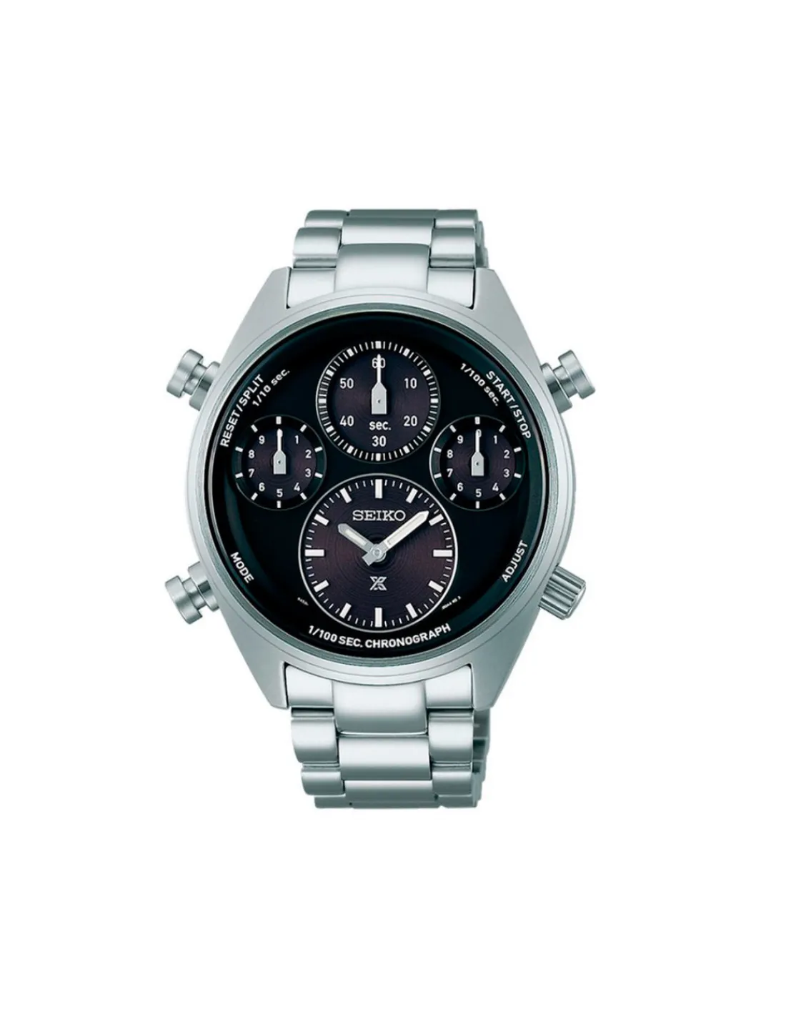 Reloj Seiko Prospex Speedtimer SFJ003P1 para hombre con caja de acero inoxidable, esfera negra y brazalete de acero. Movimiento solar japonés.