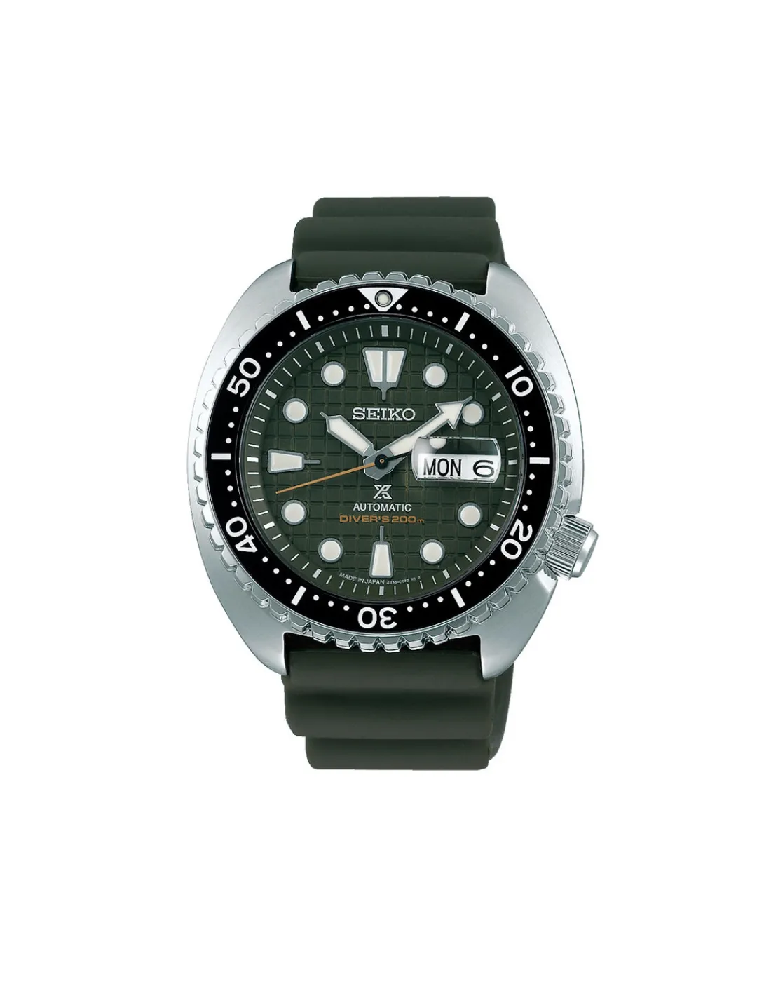 Reloj Seiko Prospex SRPE05K1 para hombre con caja de acero, esfera verde y correa de silicona. Movimiento automático (calibre 4R36) con capacidad de carga manual y 41 horas de reserva de marcha.