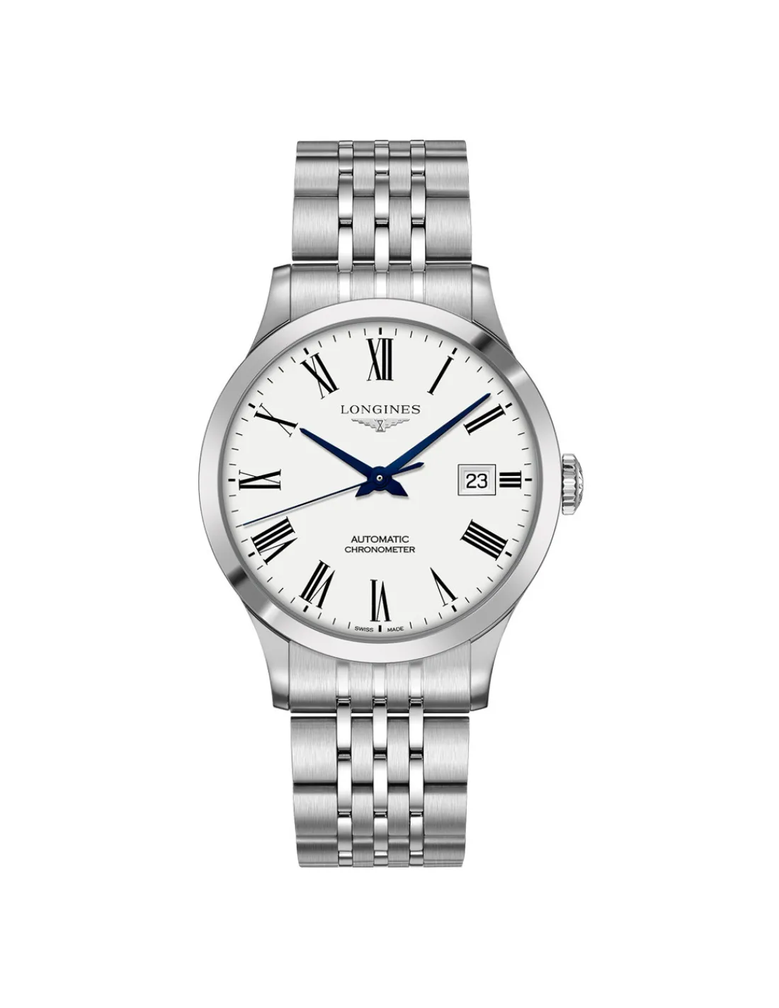 Reloj Longines Record Collection para hombre con caja de acero de 40 mm, esfera blanca con números romanos y agujas azuladas y brazalete. Movimiento automático Swiss Made con 72 horas de reserva de marcha. Una pieza elegante y versátil complementado con un certificado de cronómetro expedido por el COSC.