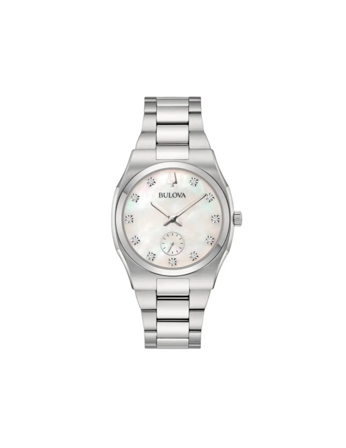 Reloj Bulova Surveyor Lady con caja de acero de 34 mm, esfera color madreperla con once elegantes diamantes engastados y cristal mineral combinado con brazalete de acero. Movimiento de cuarzo.