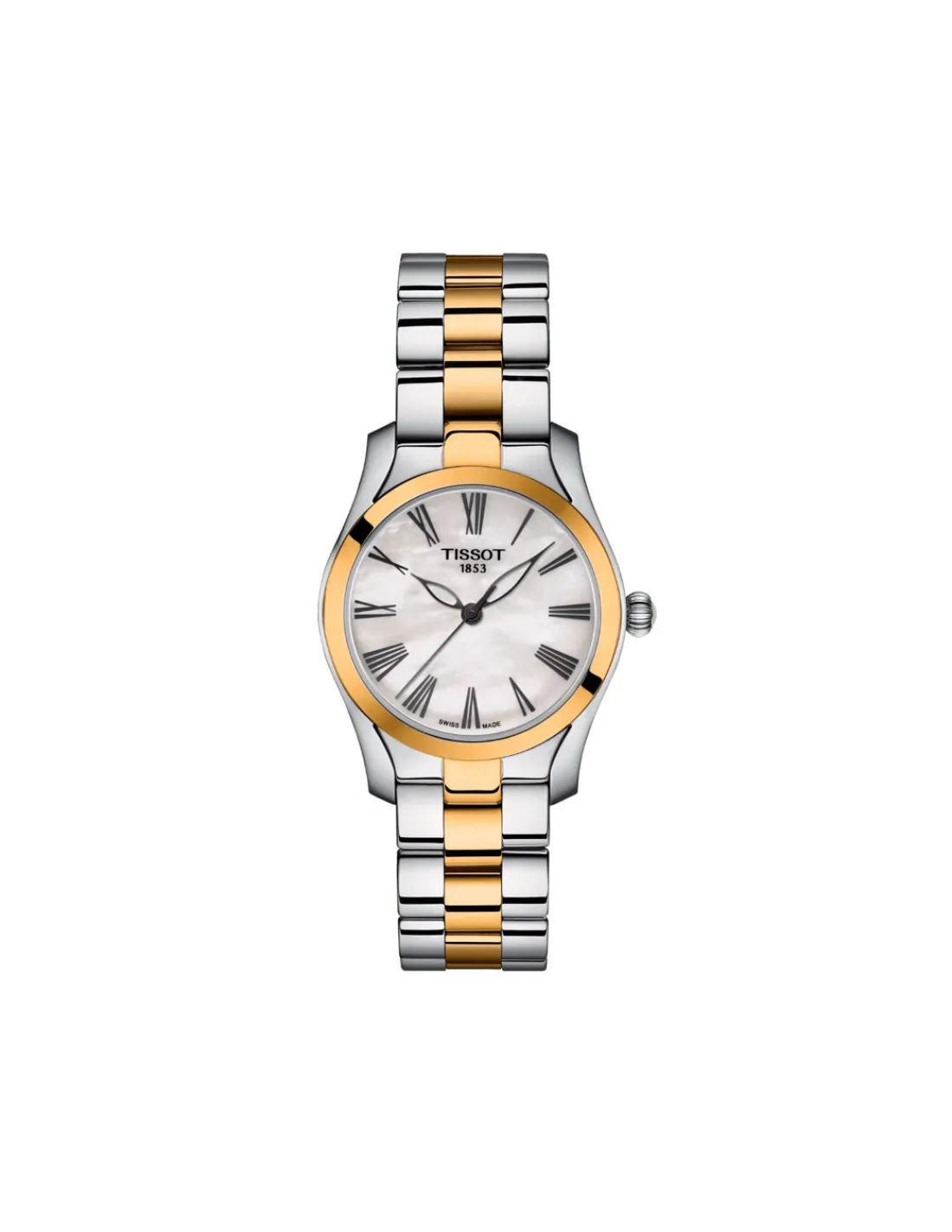 Reloj Tissot T-Wave con caja de acero inoxidable de 30 mm de diámetro y bisel de acero con revestimiento de PVD de oro amarillo, esfera blanca nacarada decorada con números romanos y brazalete de acero bicolor. Un reloj que añade un toque de color a tu look diario con movimiento de cuarzo Swiss Made.