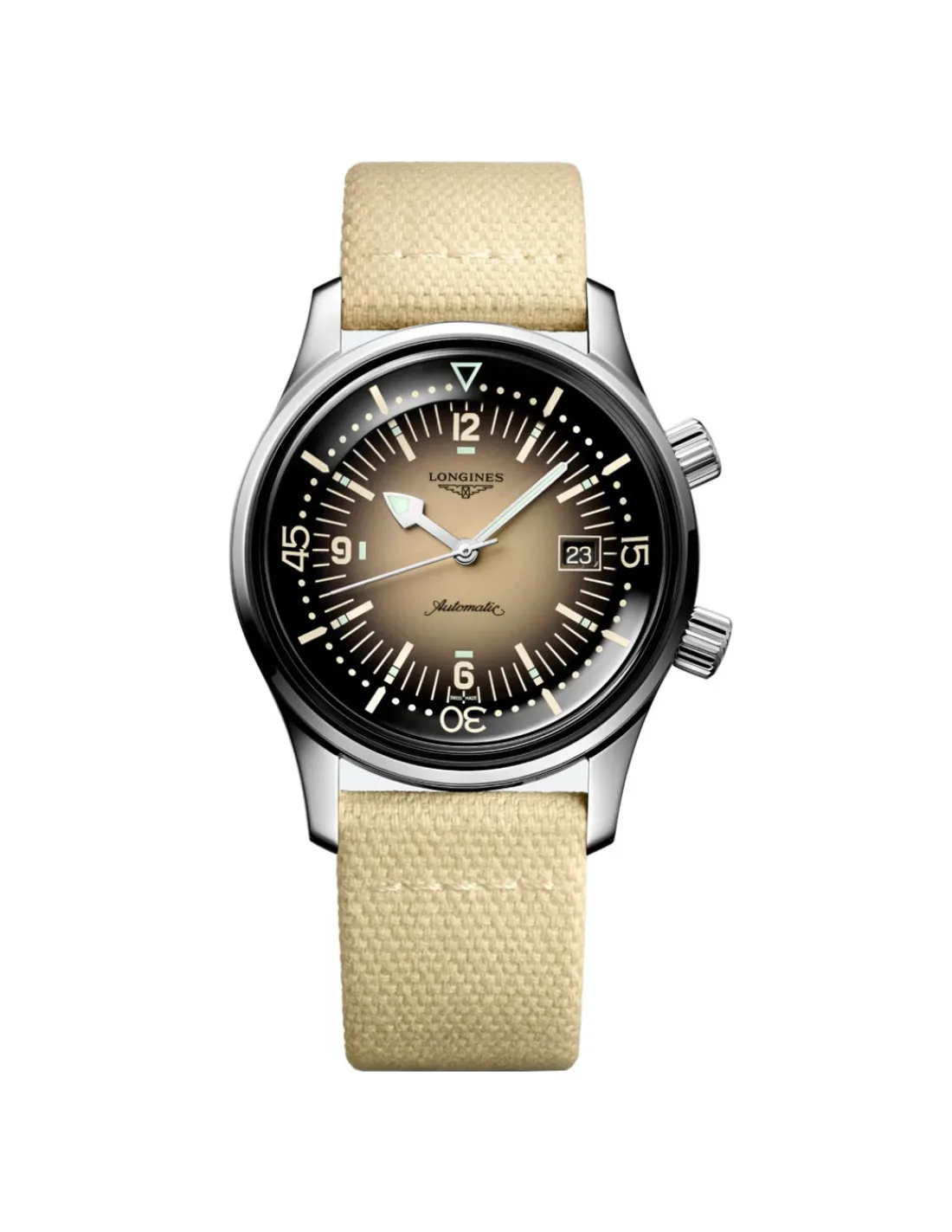 Reloj The Longines Legend Diver Watch L3.774.4.30.2 para hombre con caja de acero, esfera beige con números árabes y correa sintética color beige. Movimiento automático Swiss Made y 72 horas de reserva de marcha.