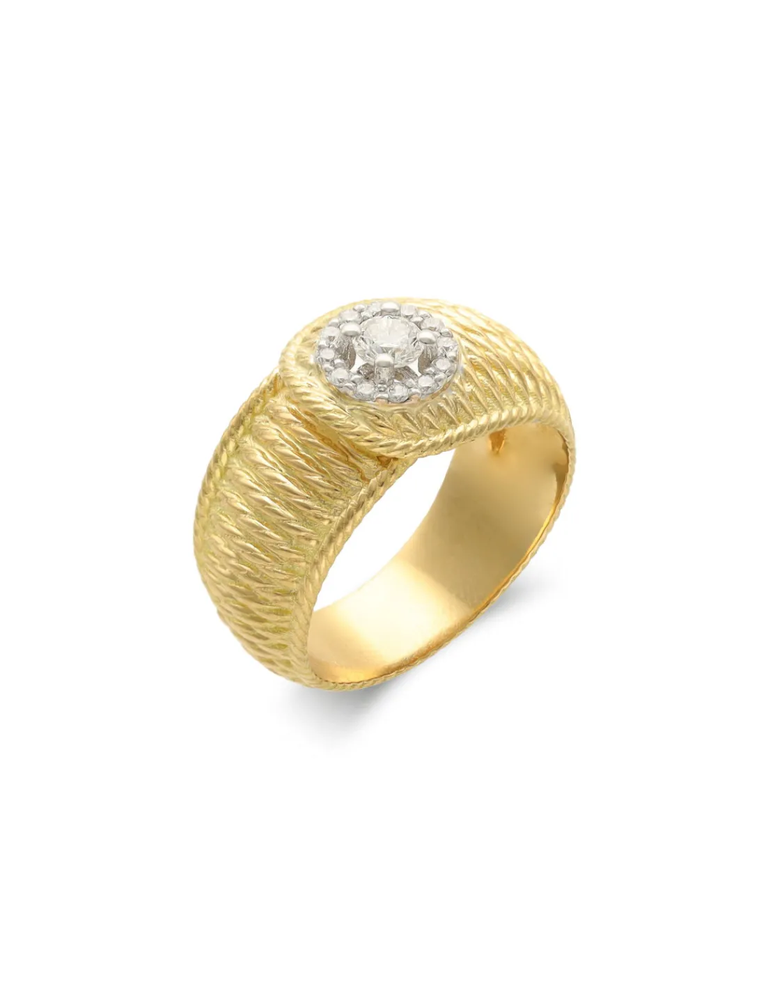 Anillo de oro amarillo 1ª Ley (750 mmas) con aro gallonado y orla de diamantes engastados en boquilla de oro blanco.