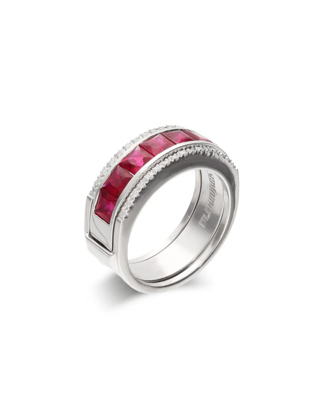 Anillo de oro blanco 1ª Ley (750 mmas) con rubíes y desmontable de oro blanco con diamantes.