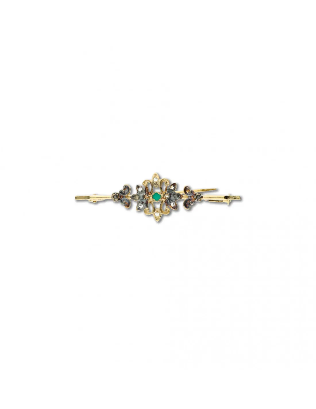 Broche de plata 1ª Ley (925 mmas) con partes de filigrana doradas y piedra verde en el centro. Una pieza exclusiva y vintage para usar de mantilla en Semana Santa, en la Feria de Abril con el mantoncillo, de madrina etc.