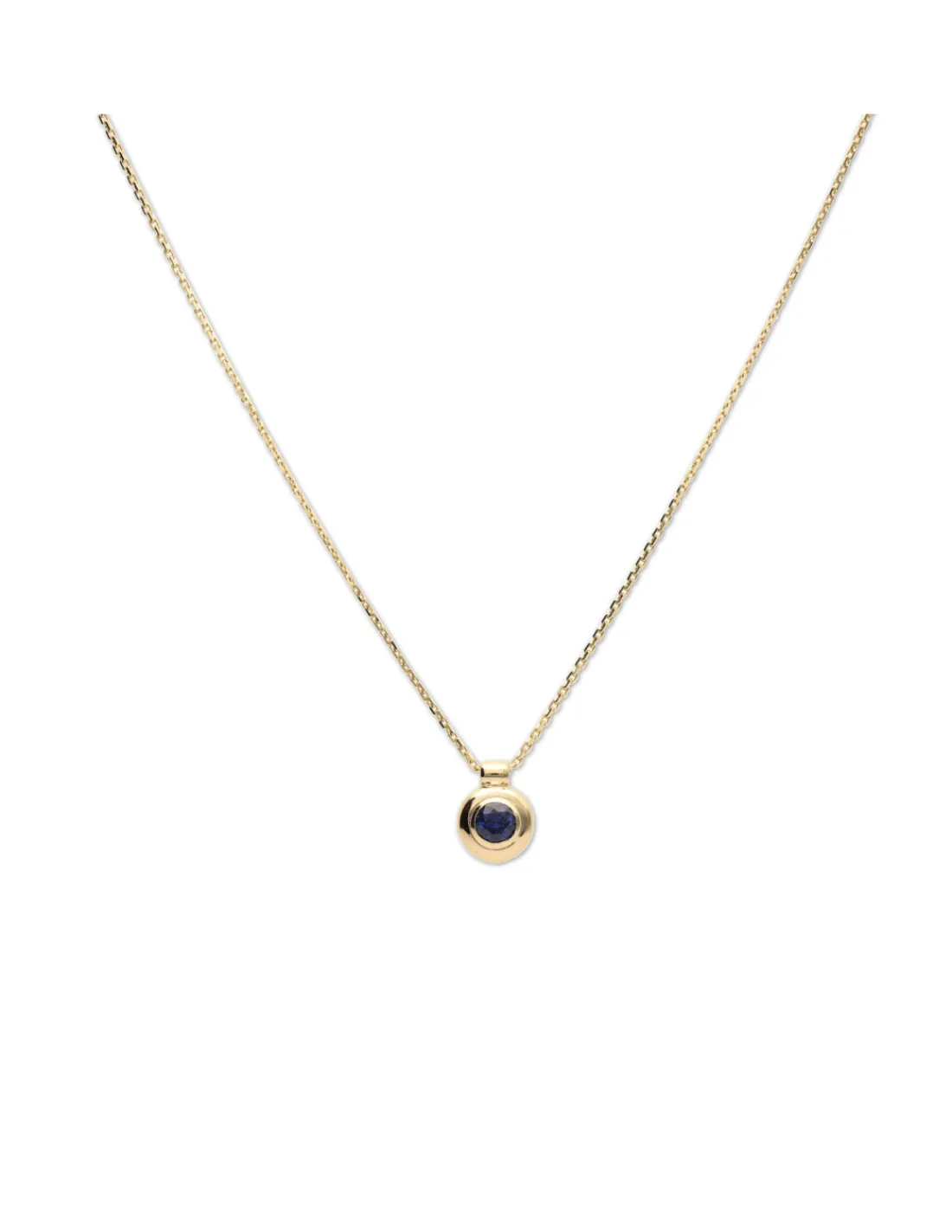 Cadena-Colgante de oro amarillo 9 kt (375 mmas) con zafiro difusión engastado en boquilla. Longitud cadena 42,5 cm. Tamaño del colgante incluyendo reasa 1 cm.