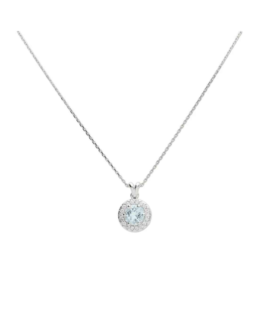Cadena-Colgante de oro blanco 1ª Ley (750 mmas) con aguamarina redonda acompañada de diamantes talla brillante.