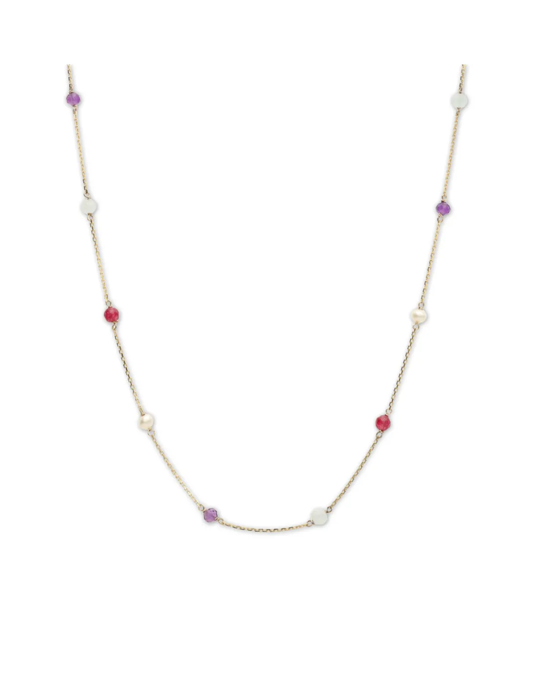 Gargantilla de oro amarillo 9 kt (375 mmas) combinada con perlas de agua dulce, amatistas, aguamarinas y jade rojo. Una pieza minimalista perfecta para combinar con otras joyas. Largo cadena 43 cm.