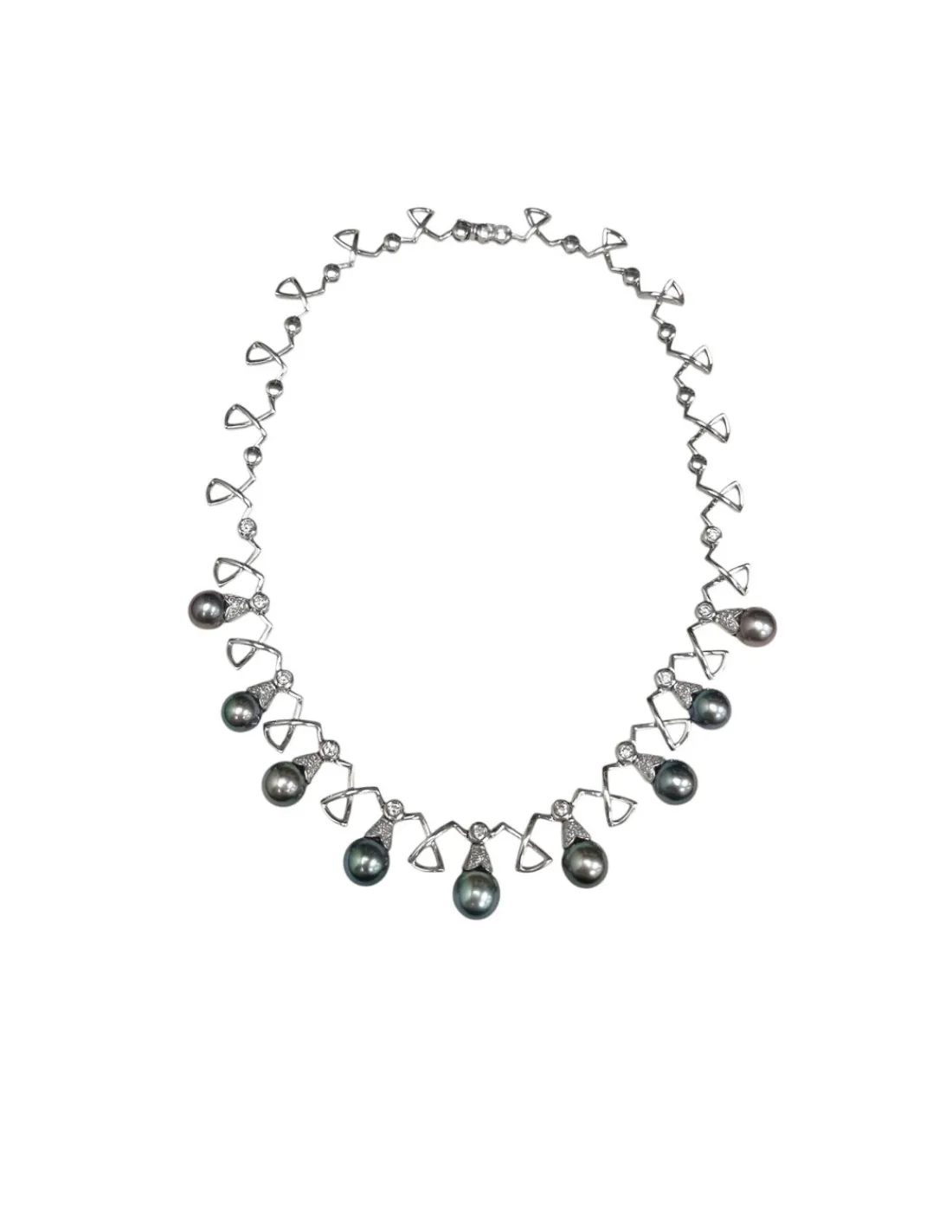 Gargantilla de oro blanco 1ª Ley (750 mmas) con diamantes talla brillante y perlas de Tahití. Una joya arquitectónica con un elegante aspecto vintage.