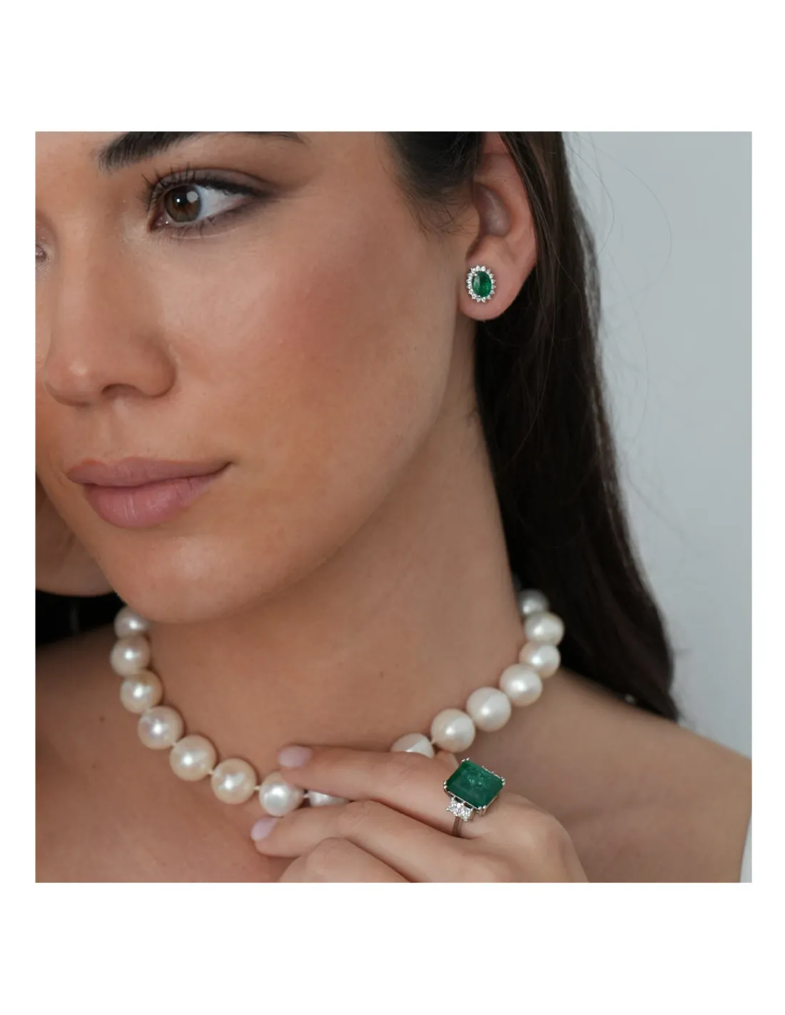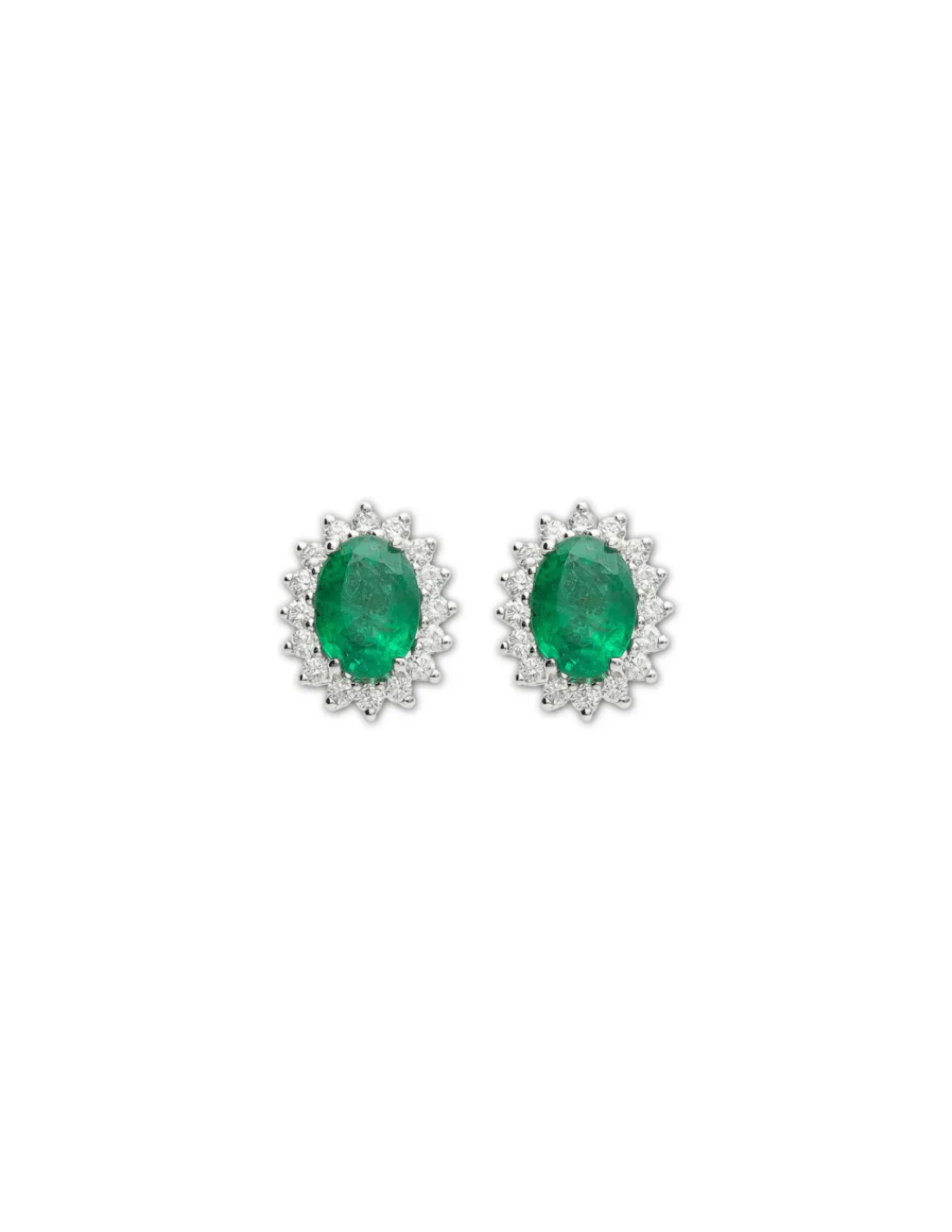 Pendientes de oro blanco 1ª Ley (750 mmas) con esmeralda oval en el centro rodeada por una roseta de diamantes talla brillante. Una joya perfecta para novias o invitadas.
