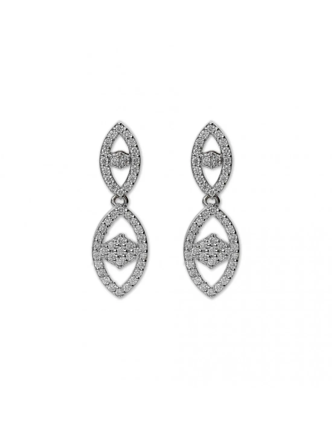 Pendientes de oro blanco 1ª Ley (750 mmas) con diamantes naturales engastados en grano. Estilo art deco. Ideal para novias. Cierre de palillo y presión y largo de 2,7 cm.