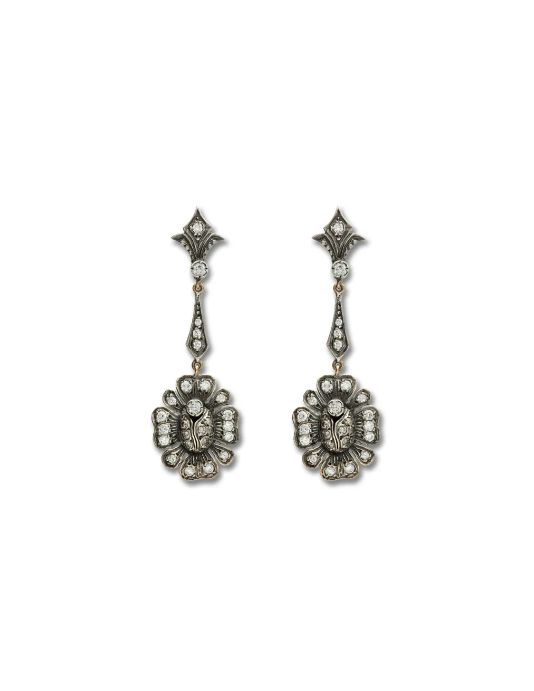 Pendientes de oro amarillo 1ª Ley (750 mmas) y plata 1 Ley (925 mmas) con estilo vintage y fabricados artesanalmente como se hacían antiguamente con base de oro y lámina de plata donde van engastados los diamantes. Un diseño ideal tanto para novia como madrina o invitada. Cierre de palillo y presión. Largo aproximado 6,3 cm.
