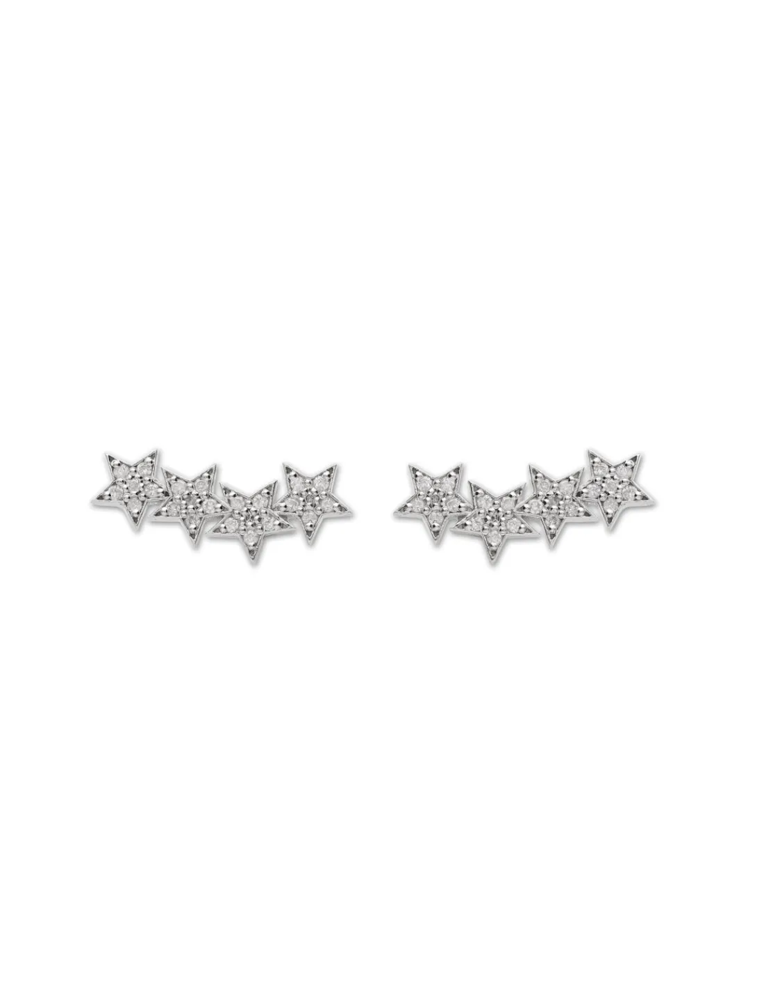 Pendientes trepadores de oro blanco 9 kt (375 mmas) con diseño de estrellas y diamantes engastados. Esta joya en tendencia es la opción idónea para fuertes personalidades.
