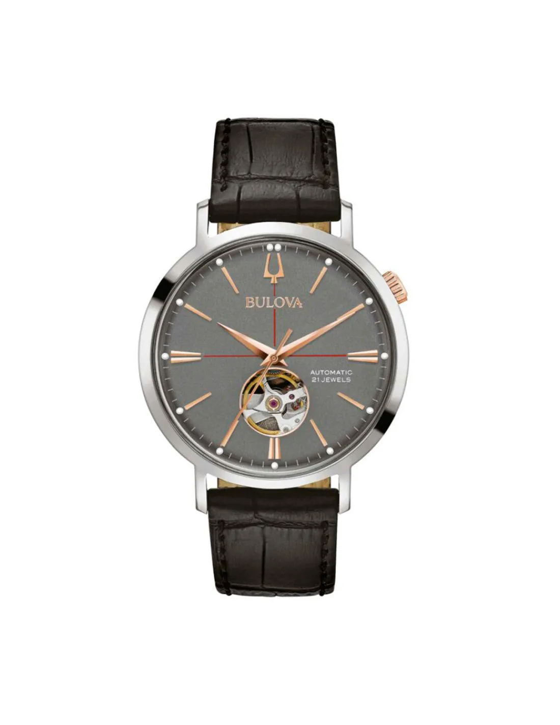 Reloj Bulova Aerojet para hombre con caja de acero de 41 mm, esfera color gris antracita con fondo a rosca transparente con movimiento a la vista y cristal mineral combinado con correa de piel negra. Movimiento automático.