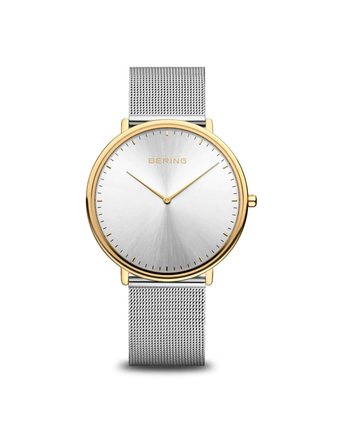 Reloj Bering Classic para mujer con caja de acero inoxidable color oro brillante de 39 mm de diámetro, esfera plata y cristal de zafiro combinado con pulsera de malla milanesa. Un reloj clásico y purista con un estilo perfeccionado. Movimiento de cuarzo.