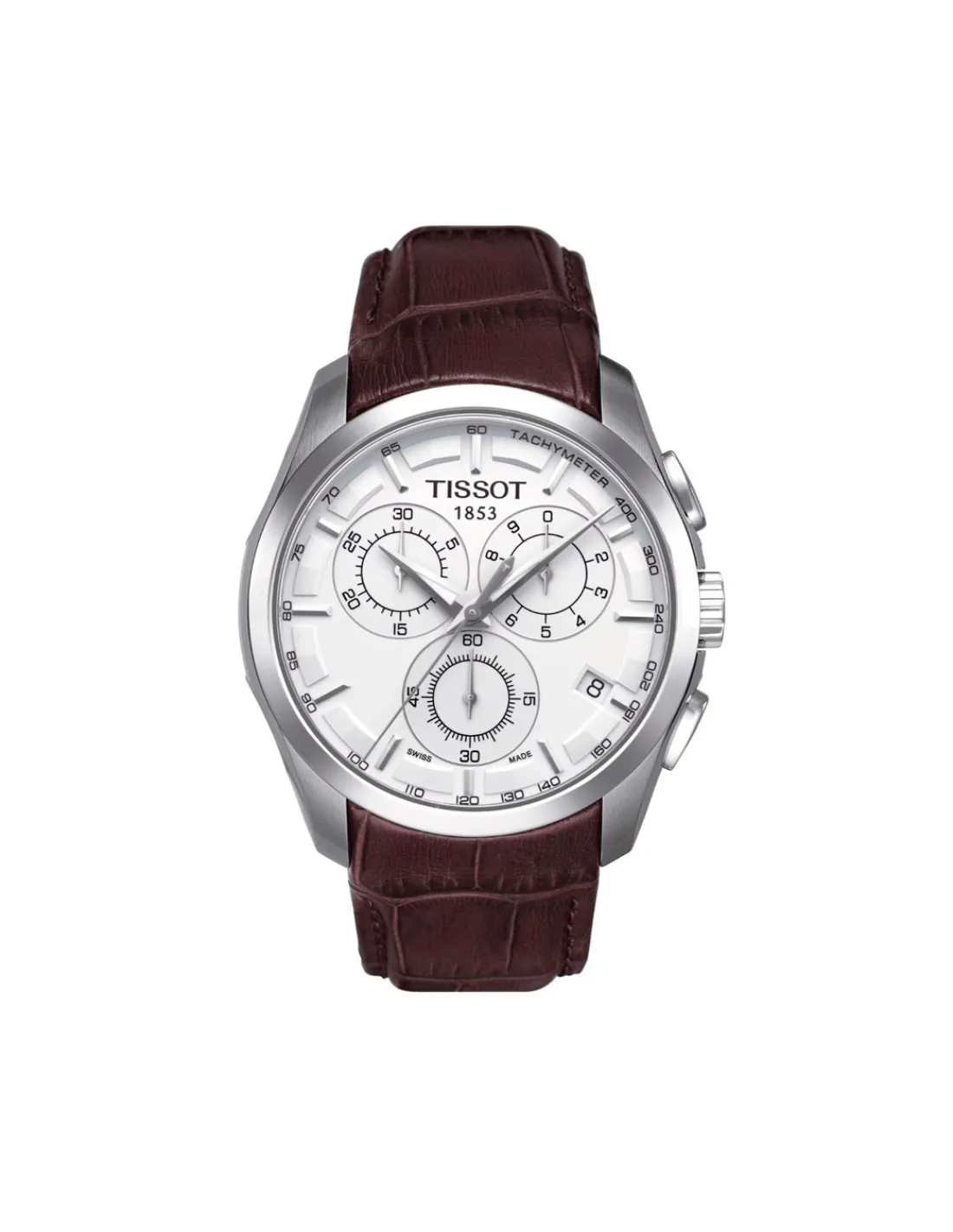 Reloj Tissot Couturier para hombre con caja de acero de 41 mm de diámetro, esfera plateada con índices y agujas plateados y correa de piel marrón. Un reloj que mezcla un estilo elegante y a la vez deportivo. Movimiento de cuarzo cronógrafo Swiss Made.