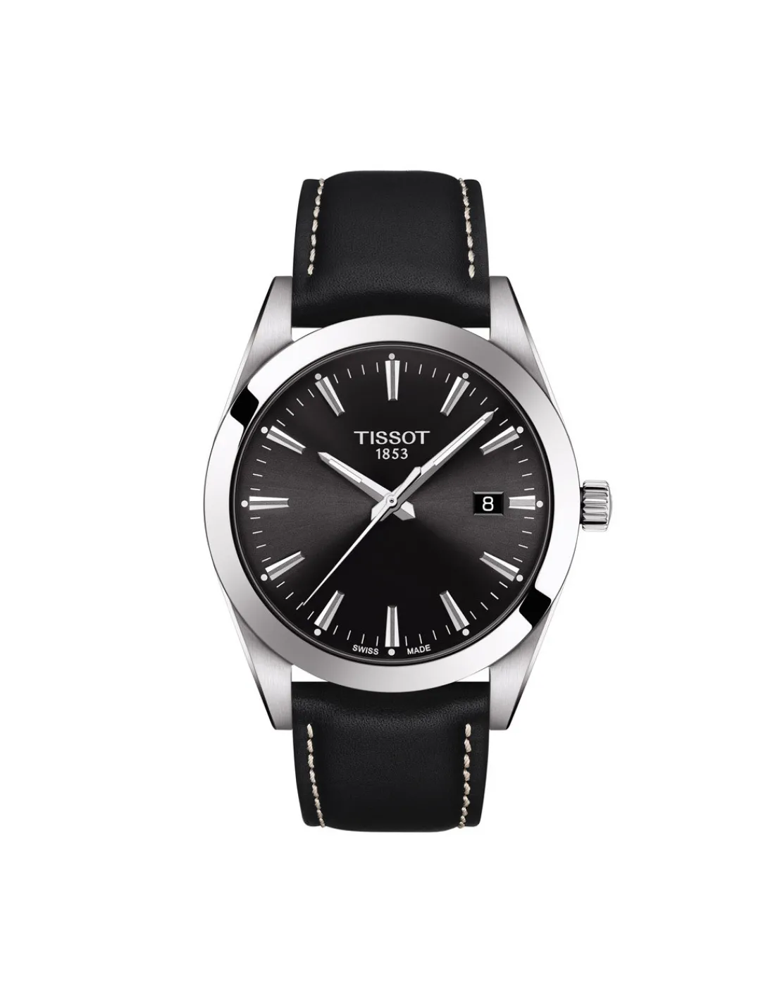 Reloj Tissot Gentleman para hombre con caja de acero de 40 mm, esfera negra y correa de piel de vaca negra con pespunte blanco. Movimiento de cuarzo fabricado en Suiza. Una pieza elegante y atemporal que te viste en los momentos más importantes.