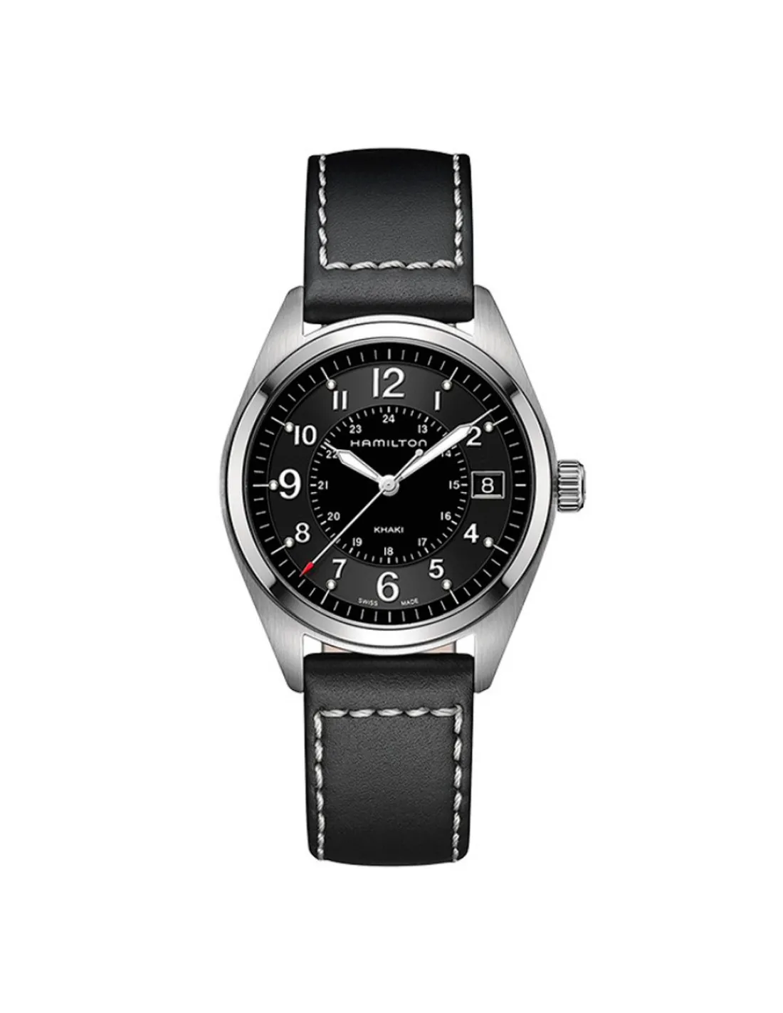 Reloj Hamilton Khaki Field para hombre con caja de acero de 40 mm de diámetro, esfera negra con números árabes y cristal de zafiro combinado con correa de piel de becerro color negro. Este reloj destaca por su arraigada identidad y demuestra su pasión por los detalles y el estilo distinguido. Calibre F07.111. Movimiento de cuarzo Swiss Made.