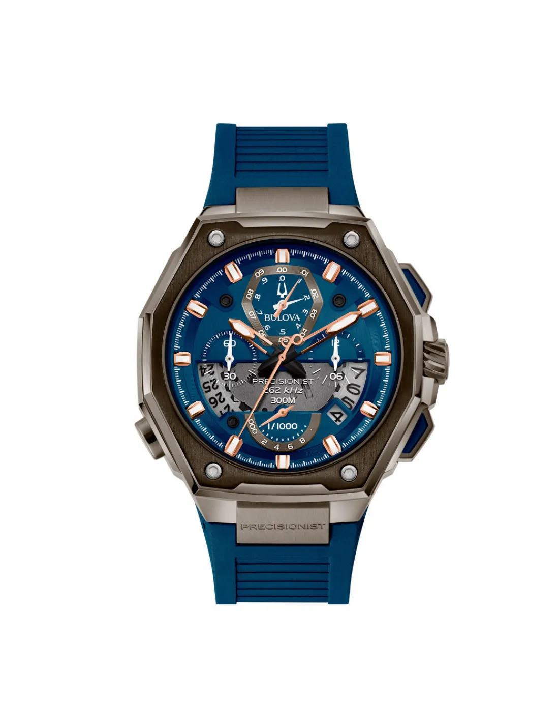 Reloj Bulova Precisionist X cronógrafo con caja de acero inoxidable de 44,7 mm de diámetro, esfera azul y cristal de zafiro antirreflejos combinado con correa de caucho azul. Movimiento de cuarzo.