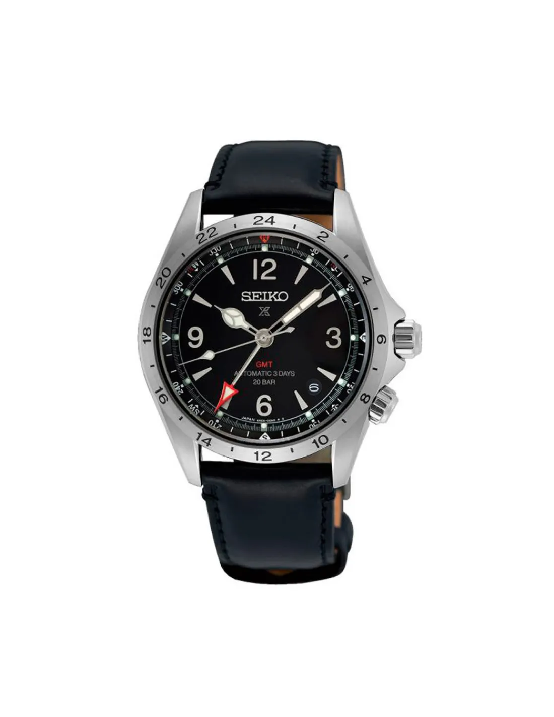 Reloj Seiko Prospex Alpinist GMT SPB379J1 con caja de acero inoxidable, esfera negra y correa de piel. Movimiento automático con capacidad de carga manual.