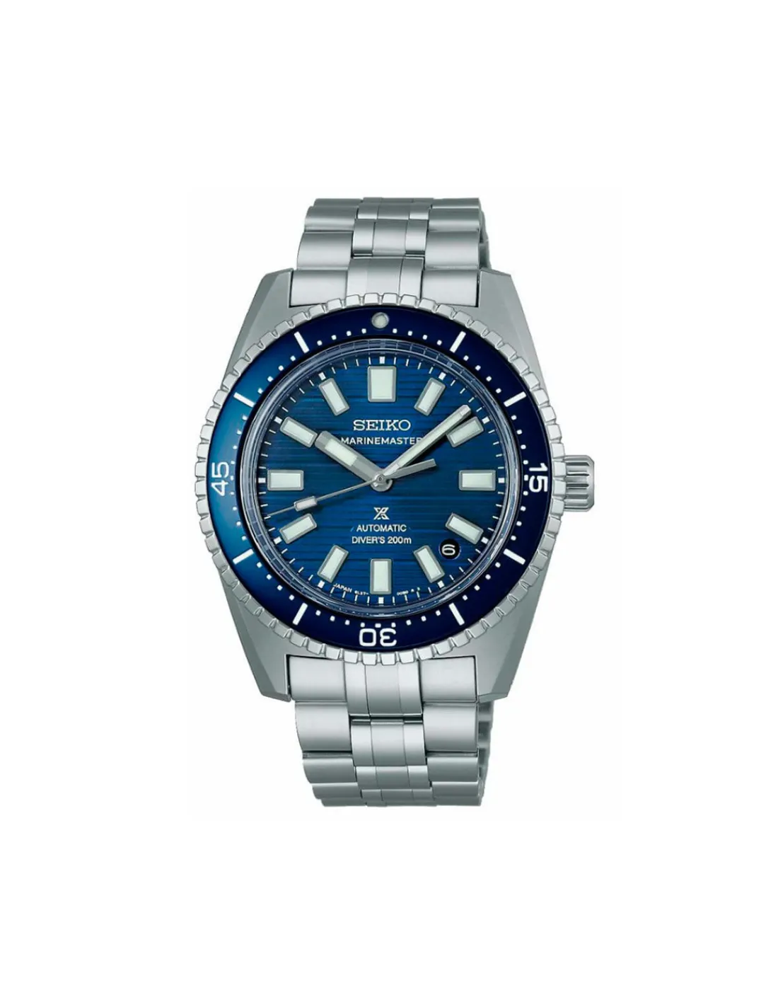 Reloj Seiko Prospex Marinemaster 1965 Heritage Divers Watch con caja de acero de 39,5 mm de diámetro, bisel giratorio unidireccional, esfera color azul con agujas, índices y bisel Lumibrite, cristal de zafiro en forma de caja y revestimiento antirreflectante en la superficie interna combinado con brazalete. Calibre 6L37. Movimiento automático con 45 horas de reserva de marcha aproximadamente.
