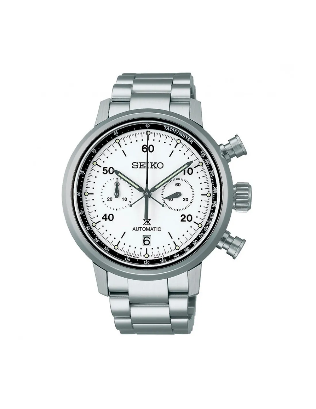 Reloj Seiko Prospex Speedtimer 8R Cronógrafo SRQ035J1 Edición Limitada 0401/1000 para hombre con caja y brazalete de acero y esfera blanca. Movimiento automático.