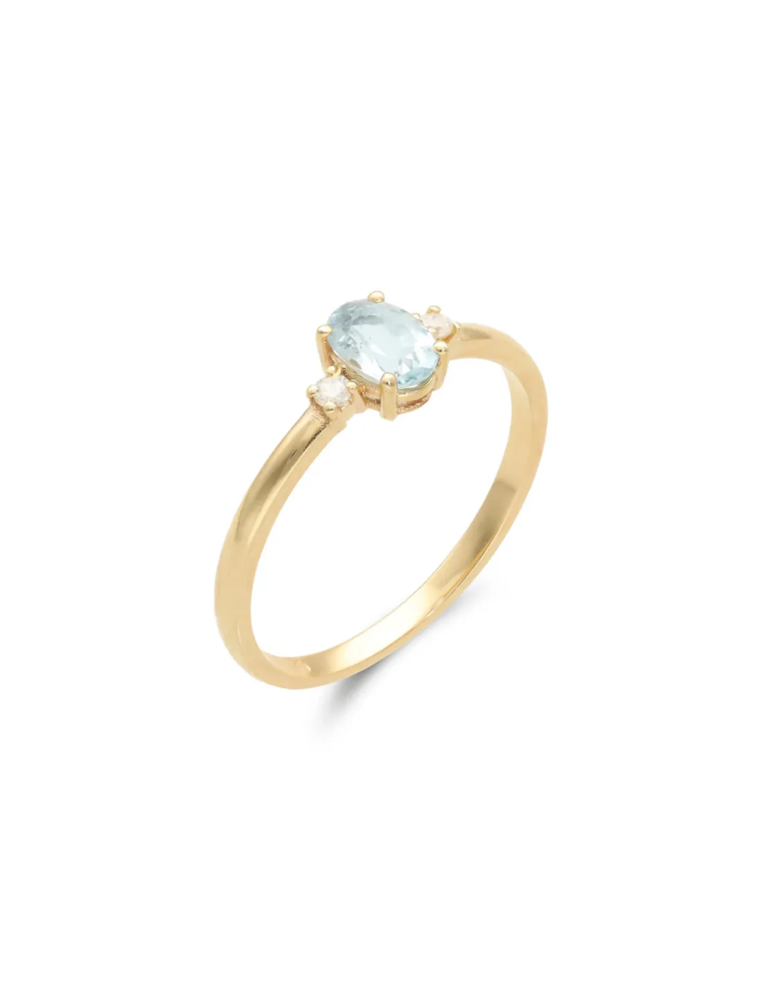 Anillo de oro amarillo 9 kt (375 mmas) con aguamarina oval y diamantes talla brillante. Una joya para el día a día con un diseño que aporta sencillez y originalidad.